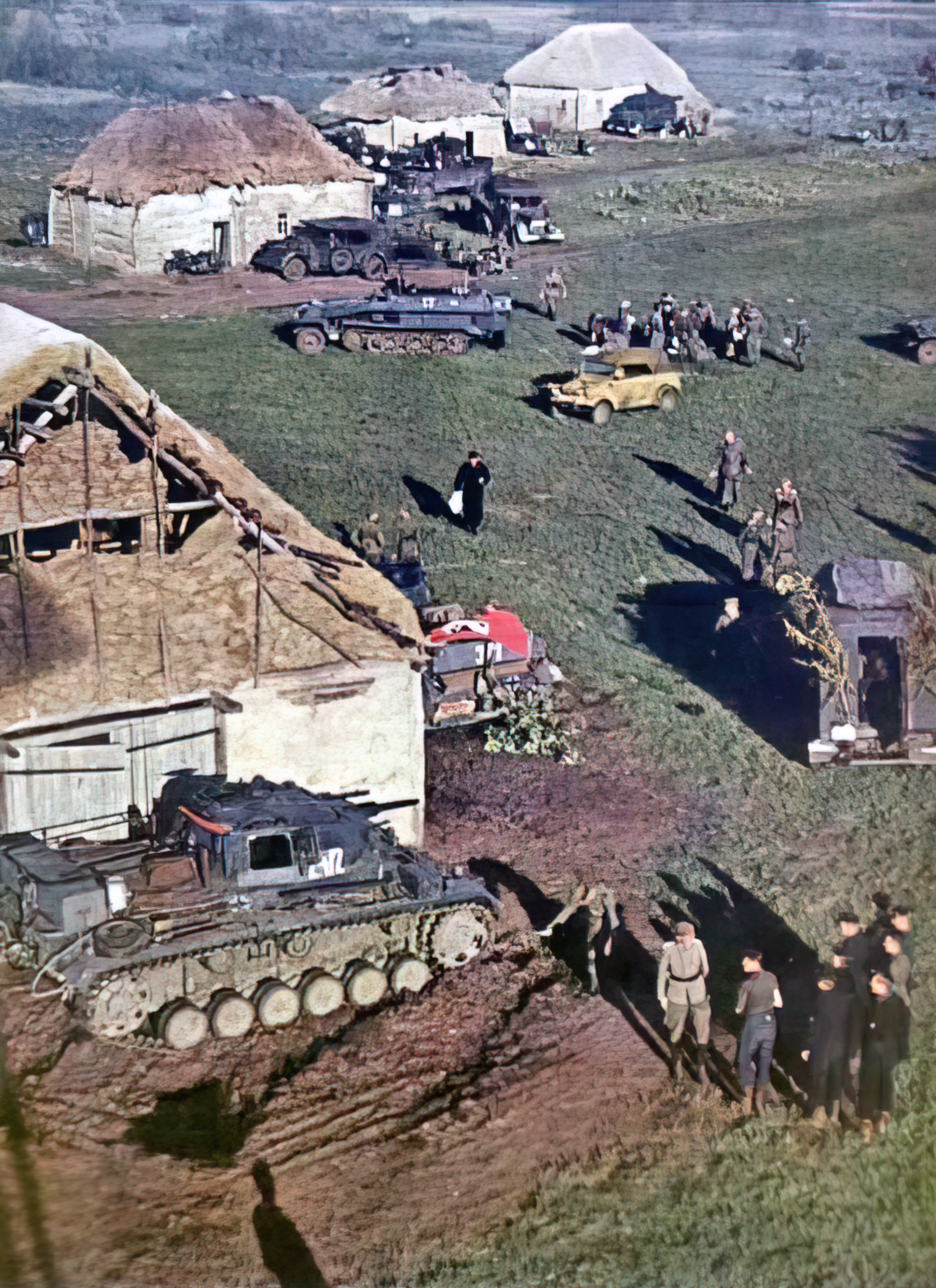 German infantry and panzers stopped at a small Russian village during the Barbarossa onslaught 1941 01