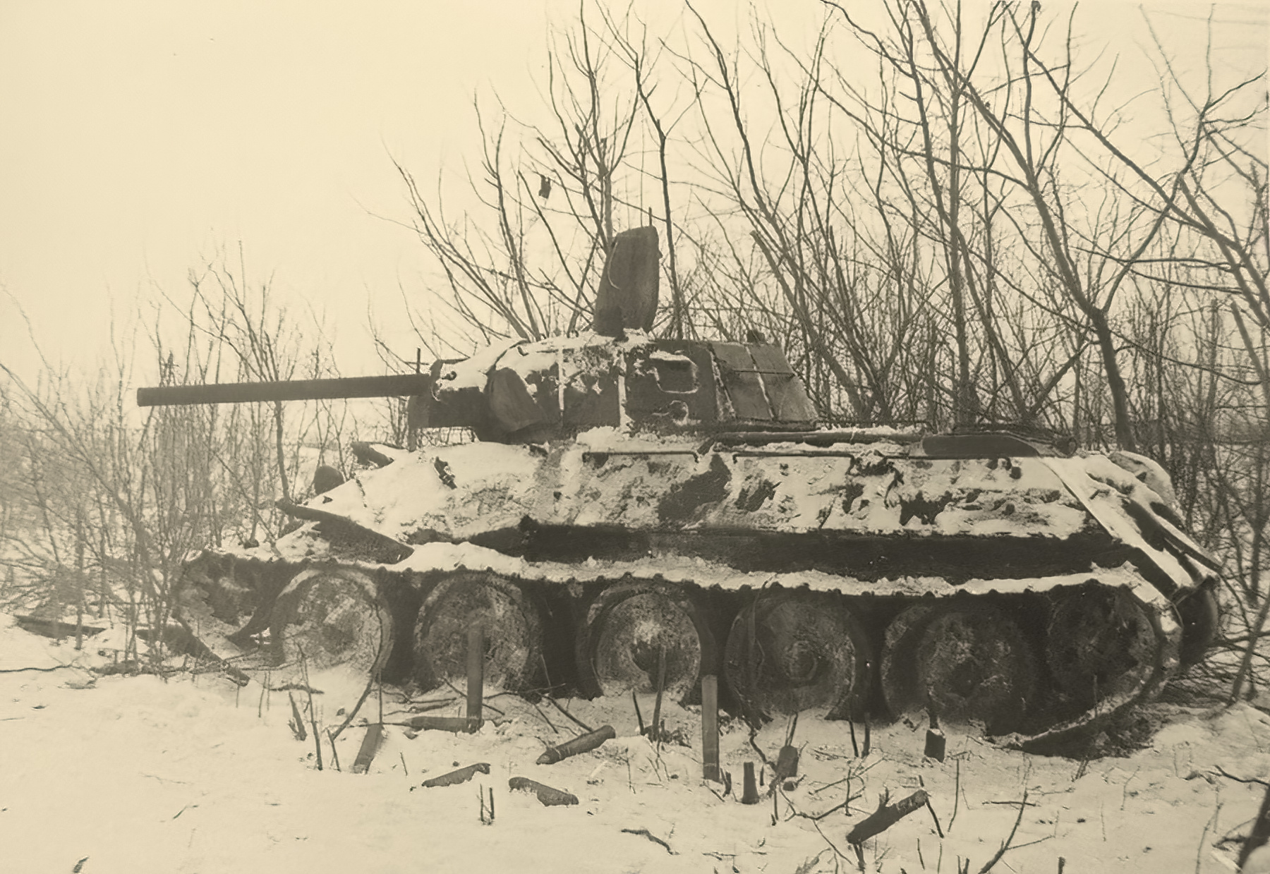 Soviet T 34 tank foreground in the snow are some of the 76 mm tank shells winter 1941 01