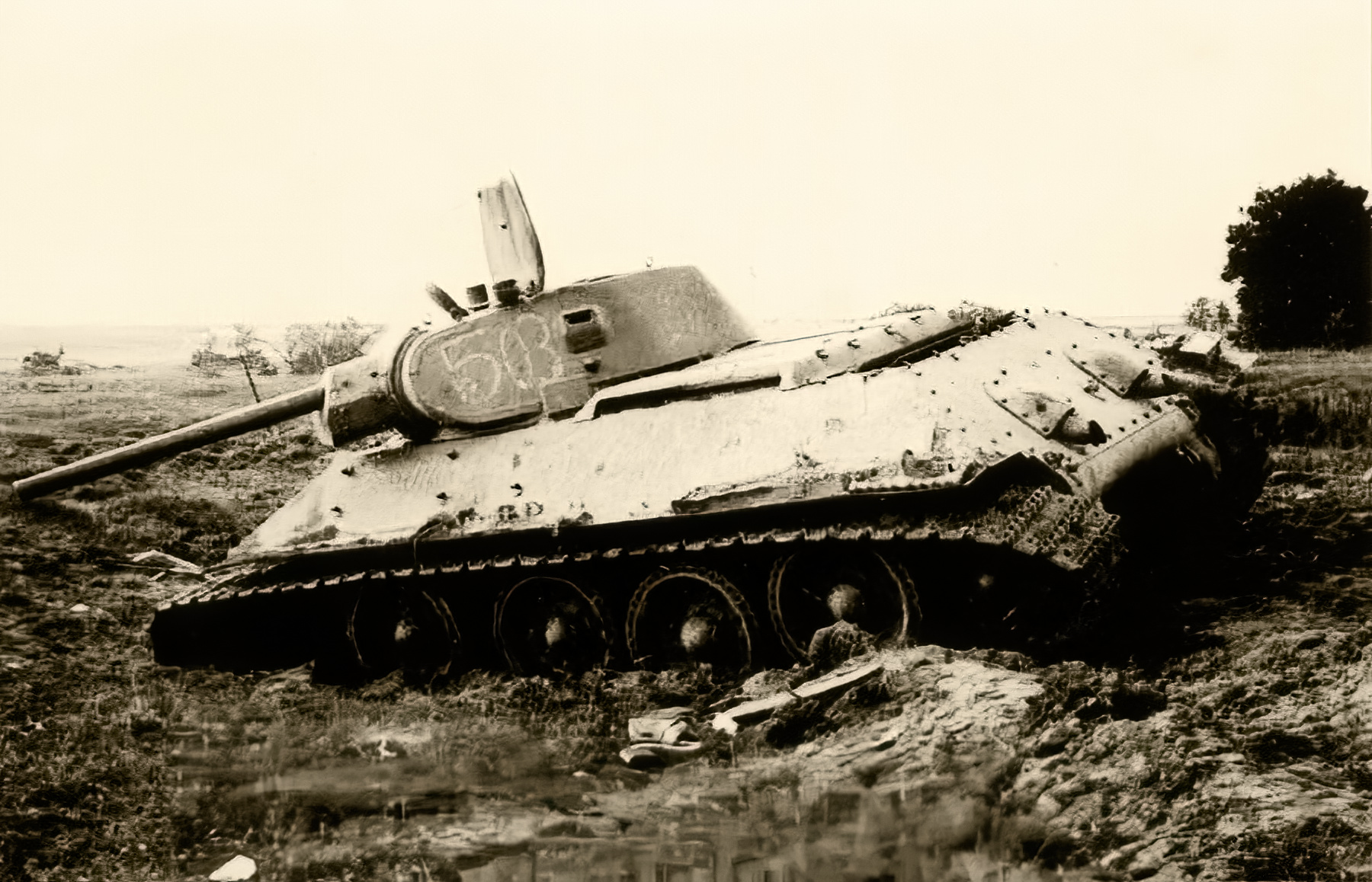 Soviet armor T 34 tank 503 lies abandoned in a ditch 1941