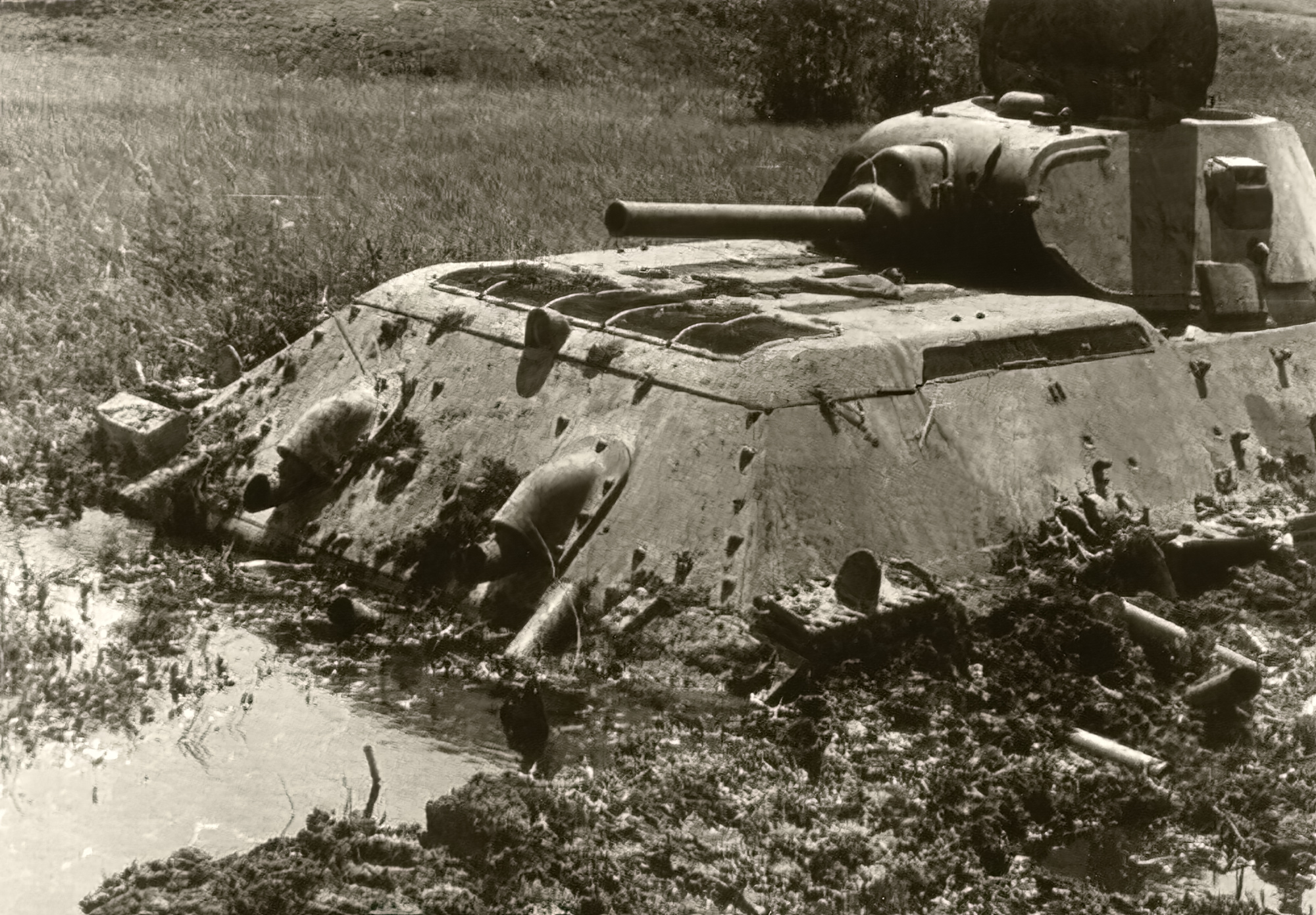 Soviet armor T 34 tank abandoned after becoming bogged is inspected by German forces 03