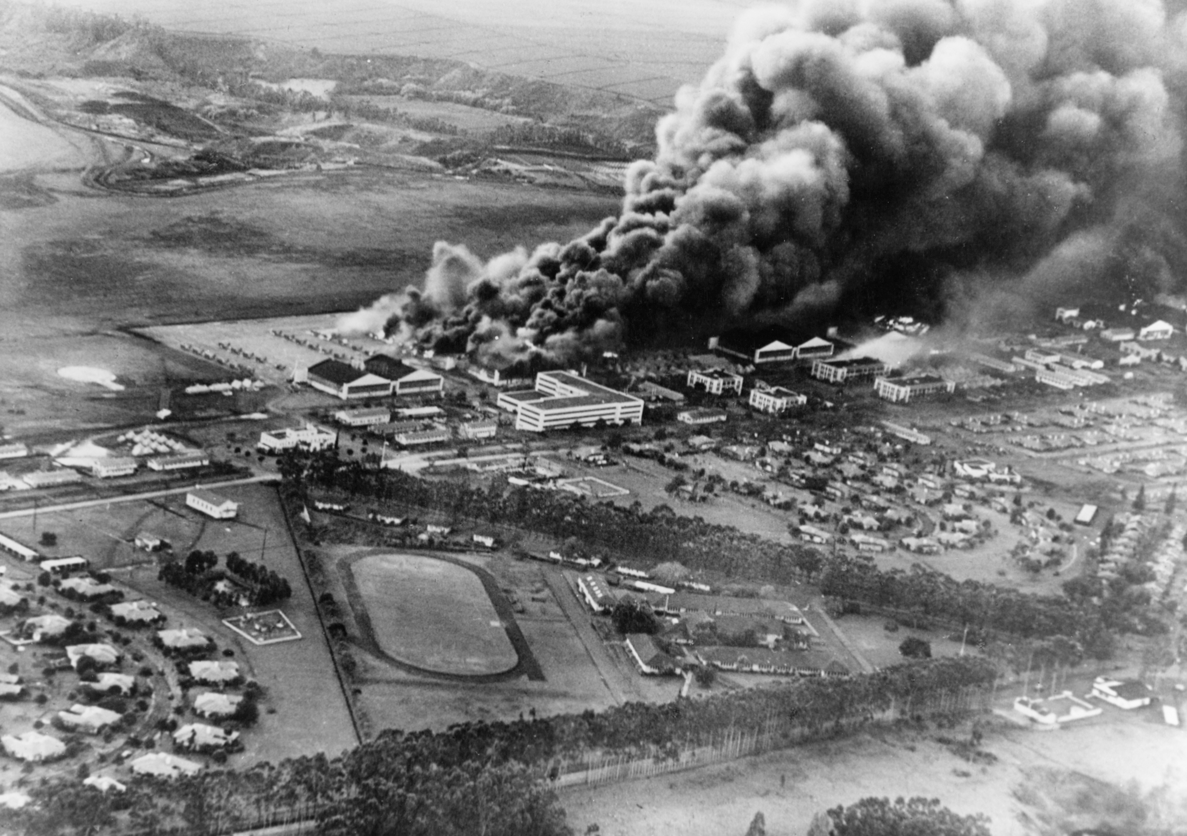 Planes and hangars burning at Wheeler Army Air Field Oahu 7th Dec 1941 NH 50473