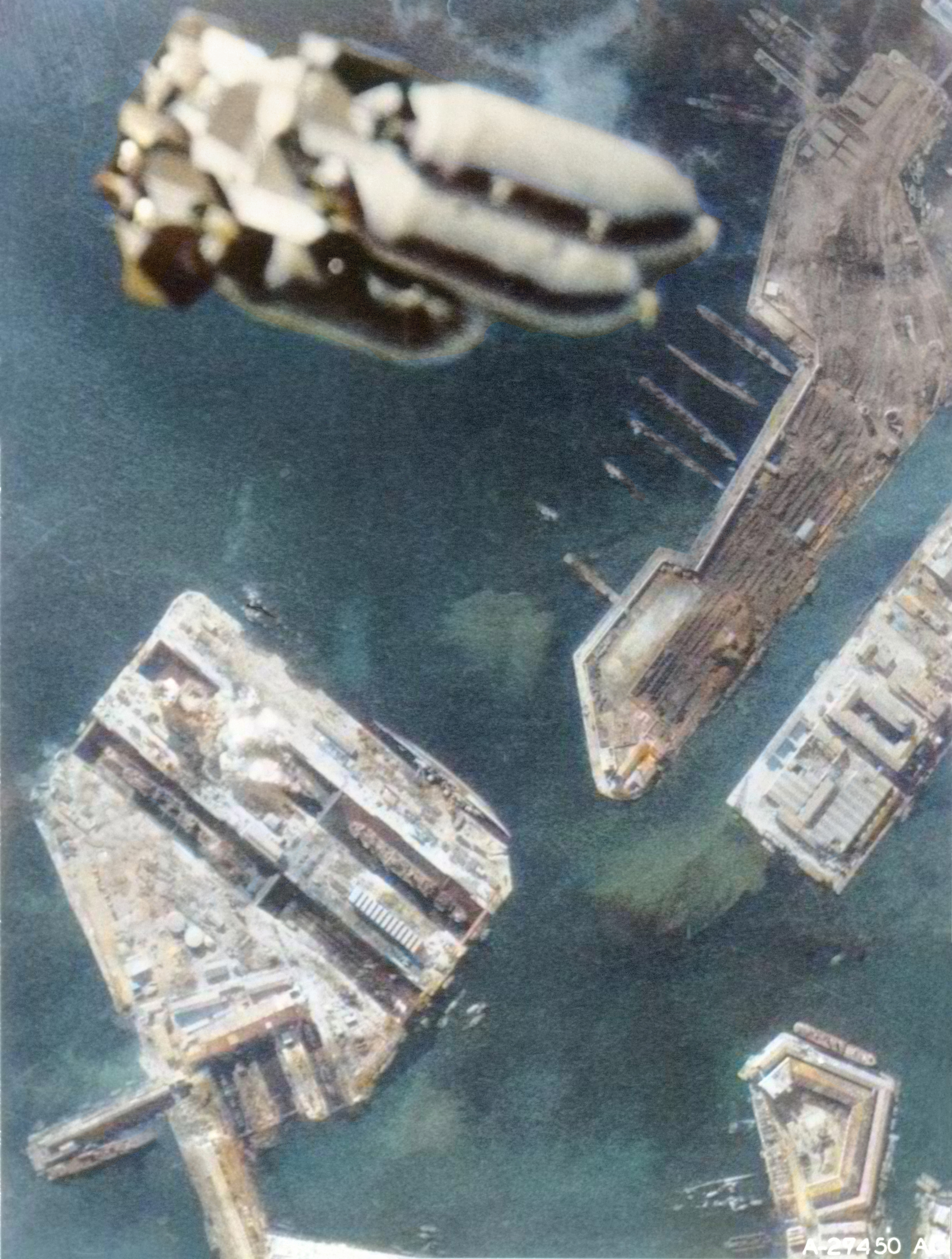 Aerial view of Casablanca harbour showing a salvo of bombs dropped on French ships 9th Nov 1942-NA274