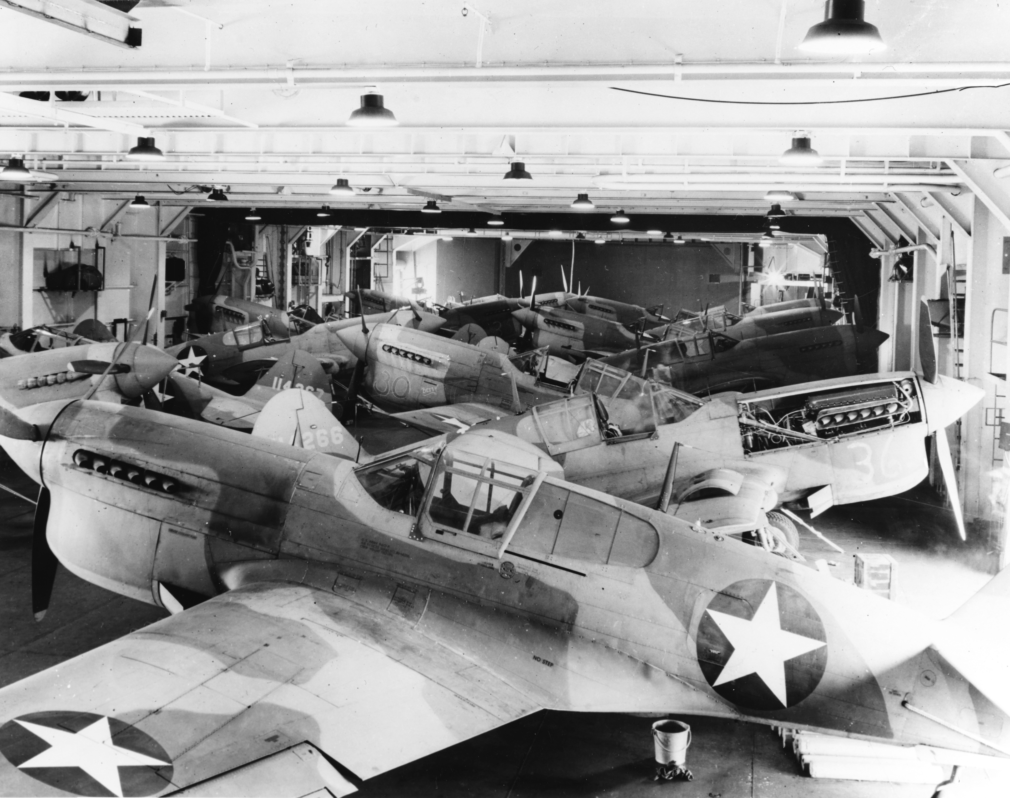 Curtiss P-40F Warhawks for operation Torch in USS Chenango (CVE 28) at Norfolk Virginia 15th Oct 1942-80 G 30508