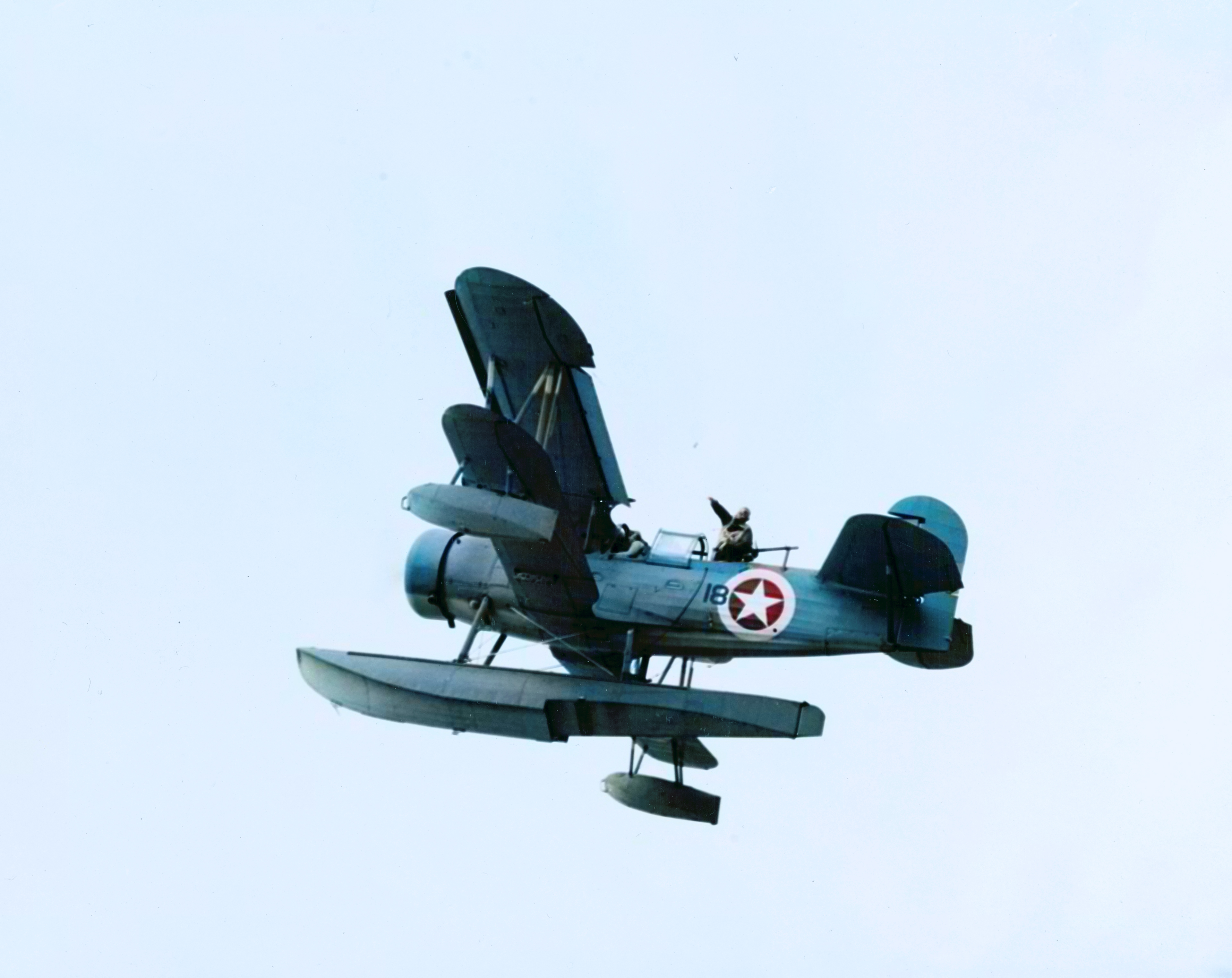 Curtiss SOC Seagull scout observation aircraft drops a message over USS Augusta (CA 31) 10th Nov 1942-80 G 30118