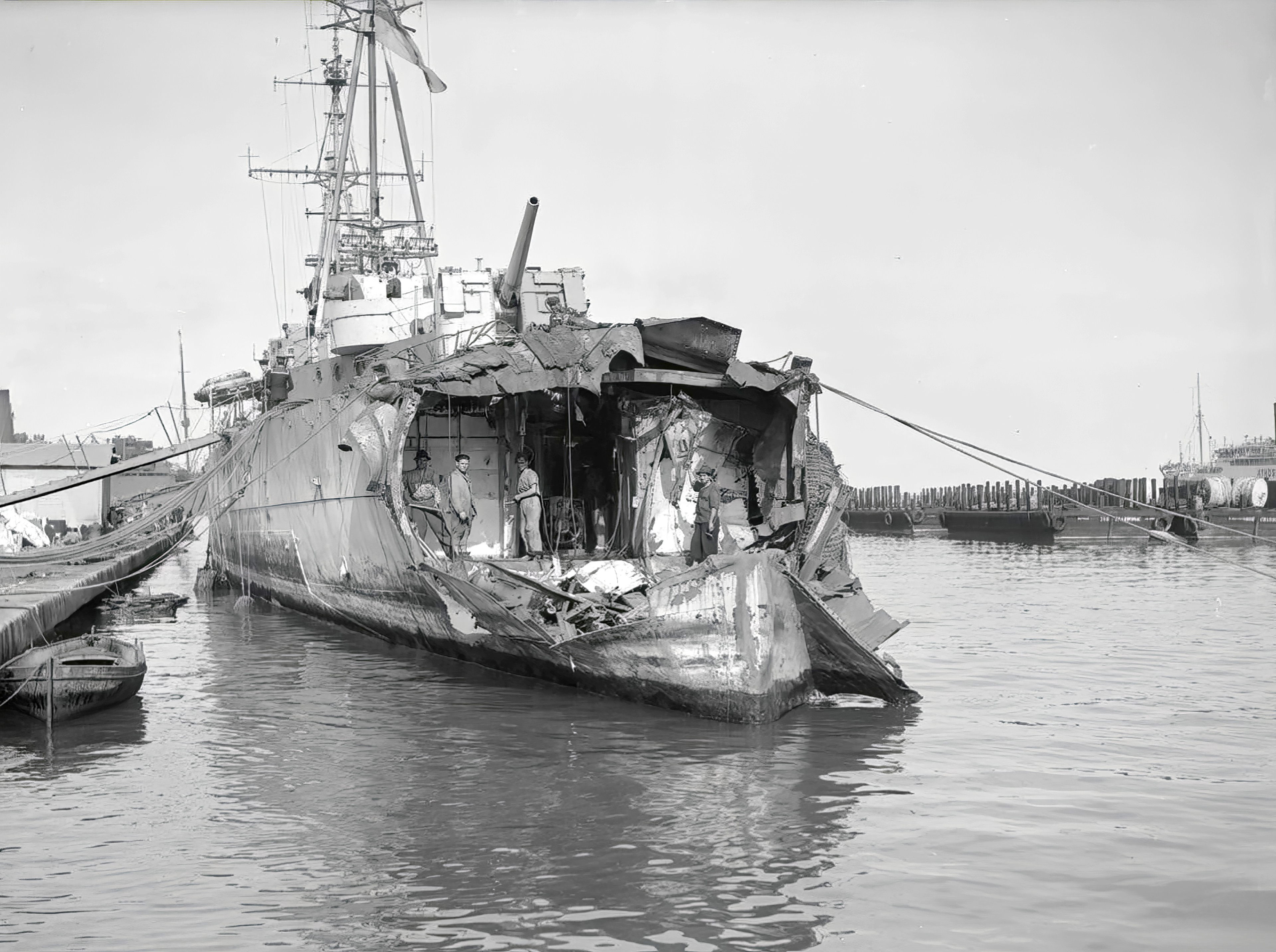 HMS Delhi RN cruiser at Algiers Bay damaged by Italian aircraft Aug 20th Nov 1942-IWM A13656