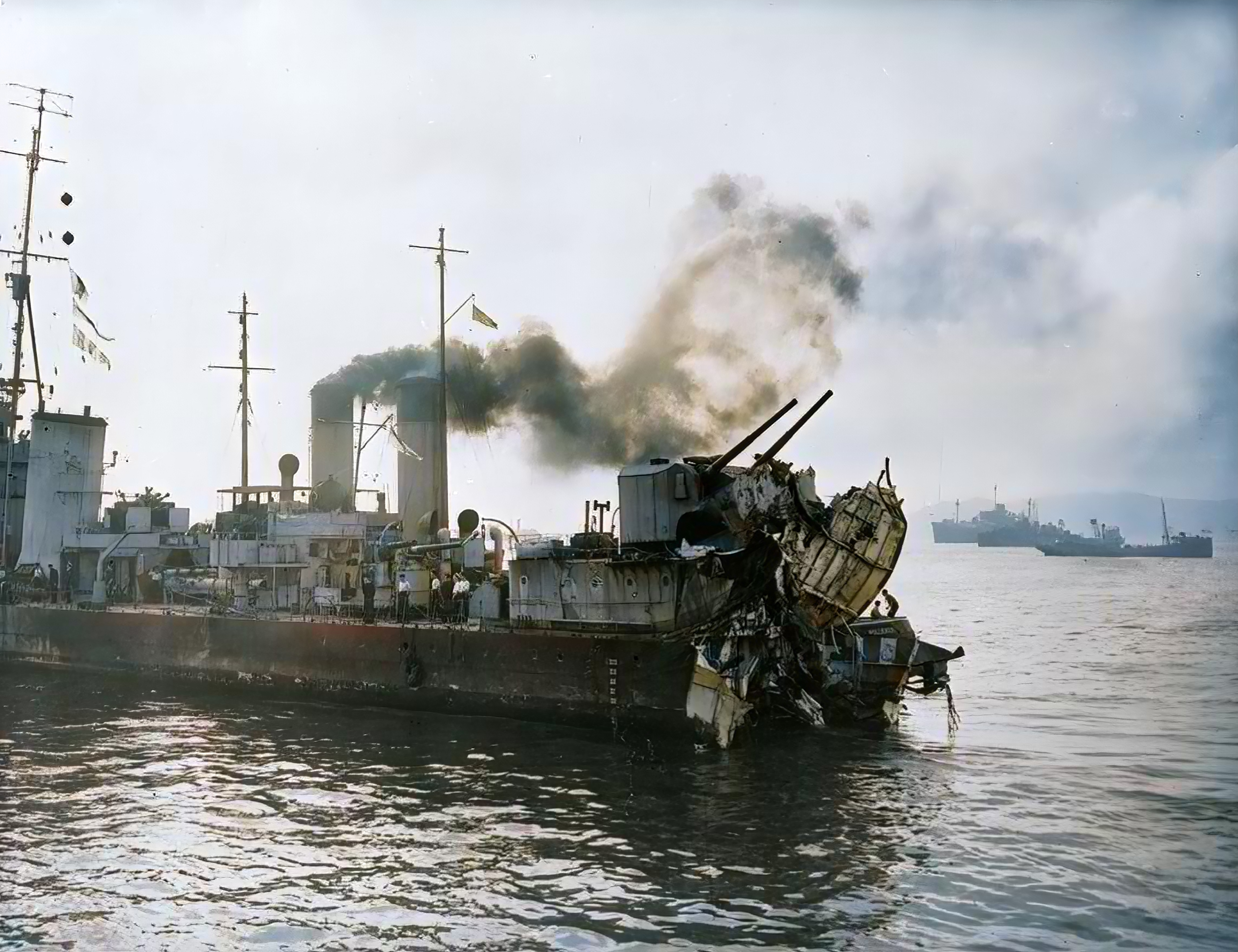 HMS Marne damaged whose stern was blown off by a torpedo being towed into Gibraltar Nov 1942 IWM A12753