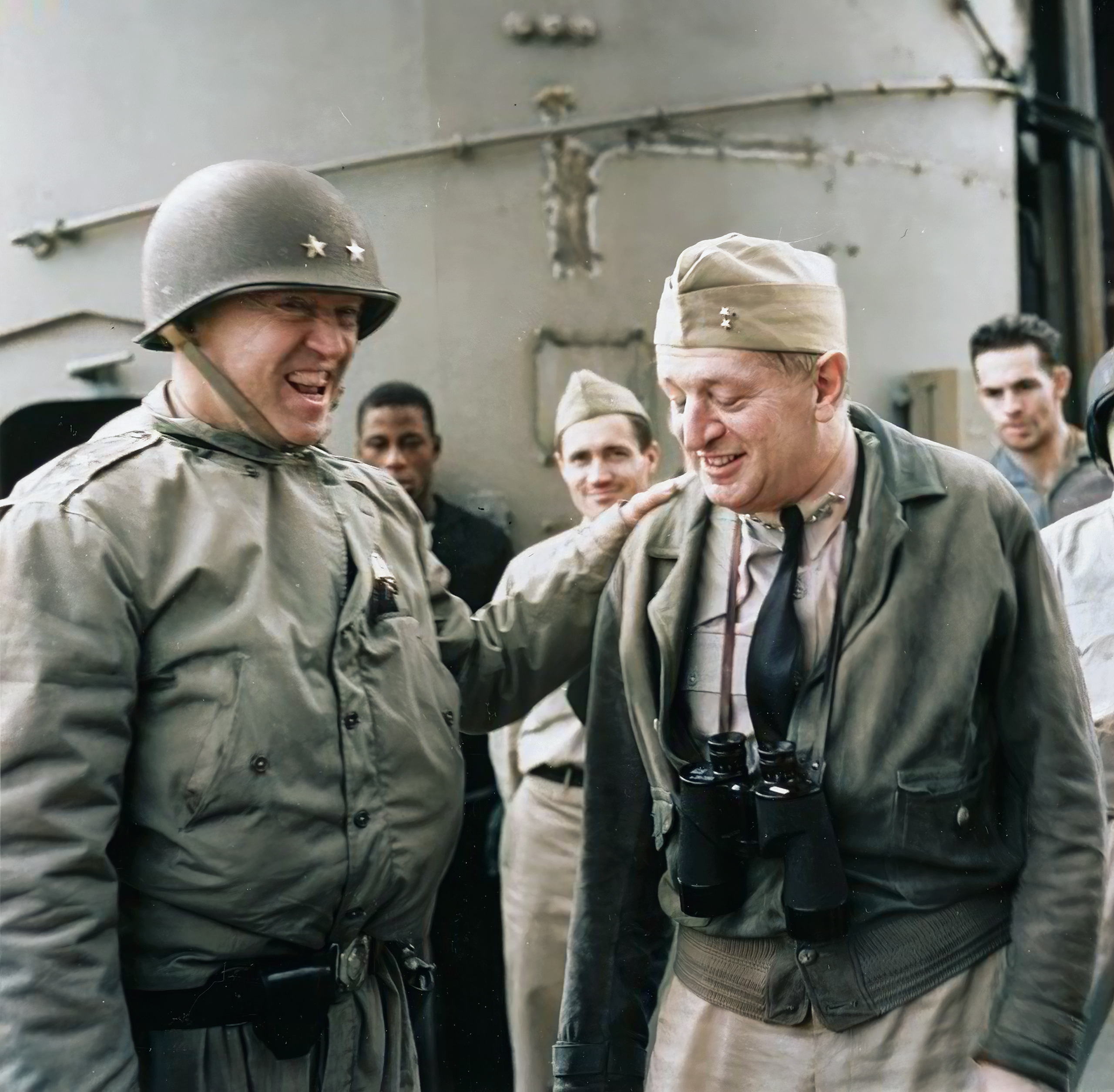 Leaders Maj Gen George S Patton USA and Rear Adm H Kent Hewitt USN aboard USS Augusta (CA 31) 01