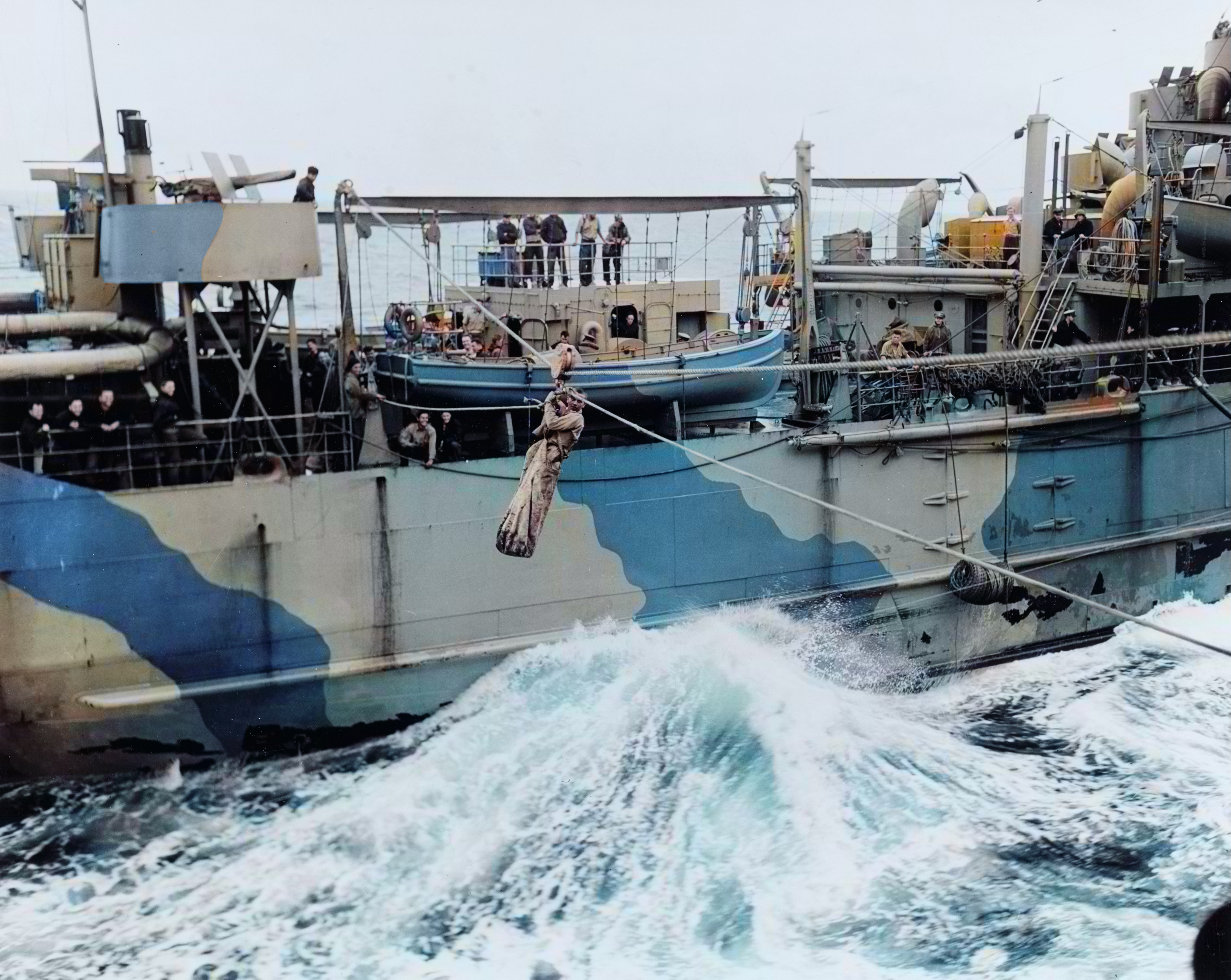 Lt Comdr Blackburn a rescued aviator transferred from USS Monadnock (CMc 4) to USS Santee (CVE 29) Torch 11th Nov 1942-80 G 30610