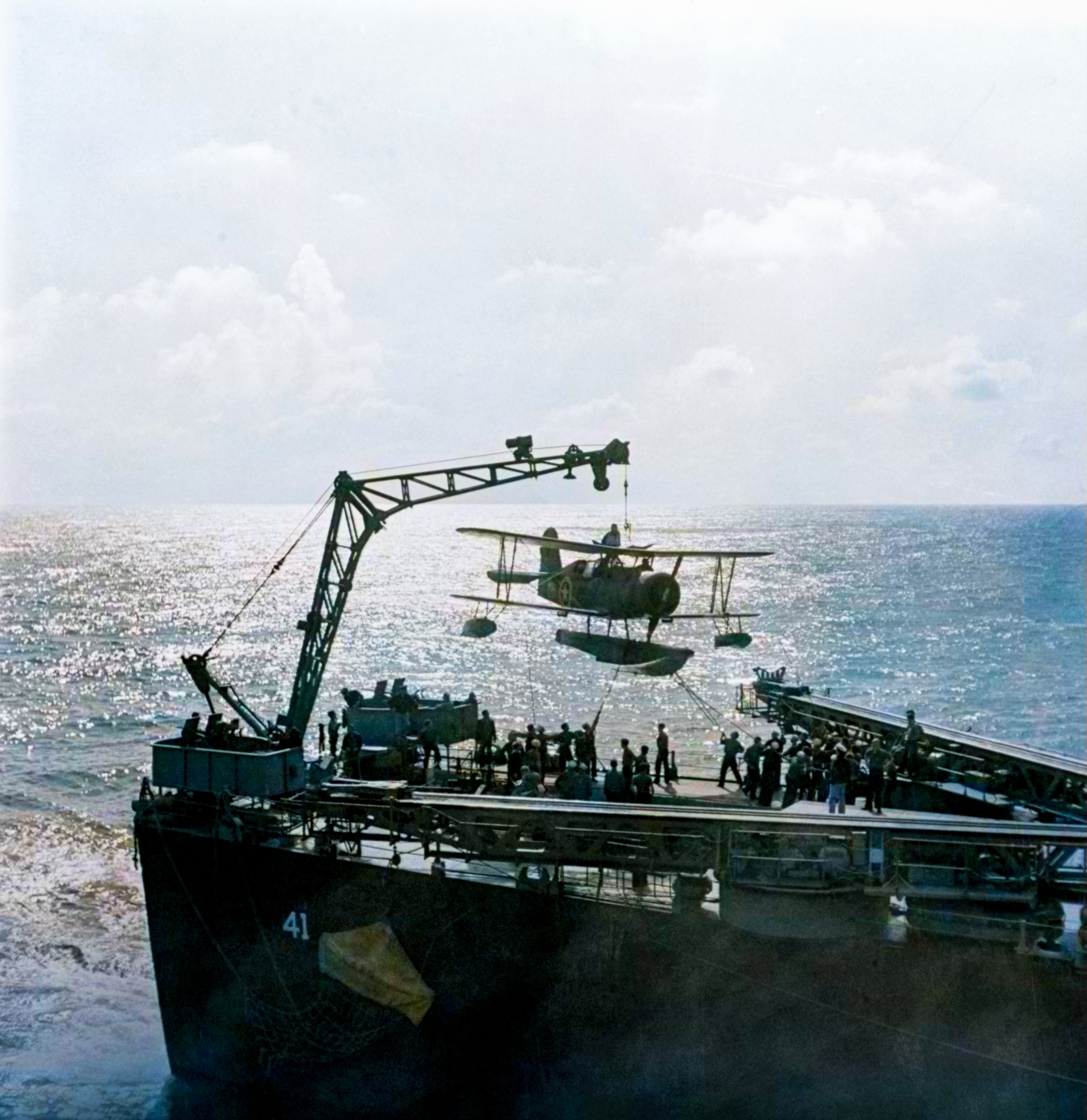 USS Philadelphia (CL 41) recovers one of her Curtiss SOC Seagull during operation Torch Nov 1942-80 G 470060