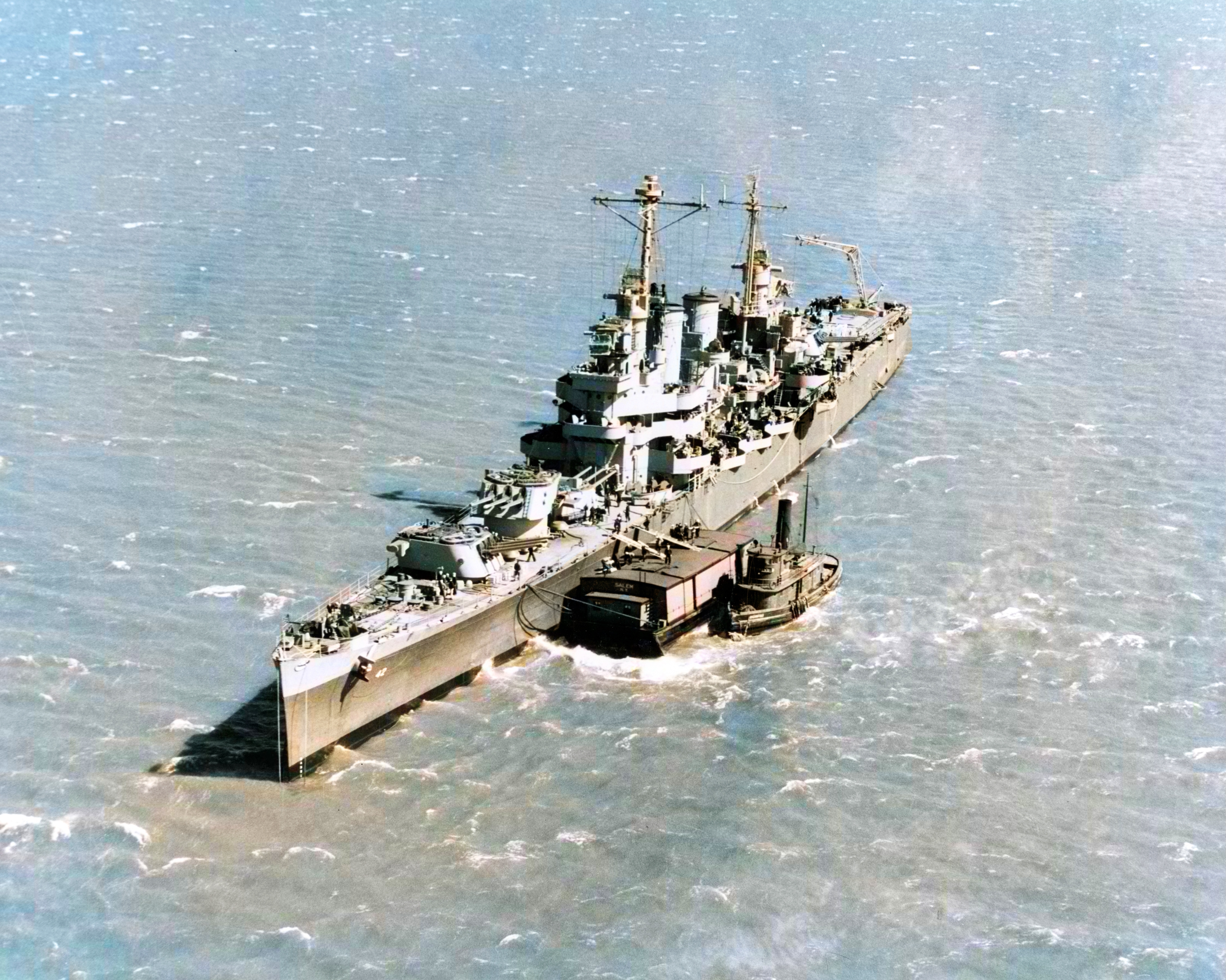 USS Savannah (CL 42) off New York City with a barge and tug alongside 1st May 1943-19 N 44025