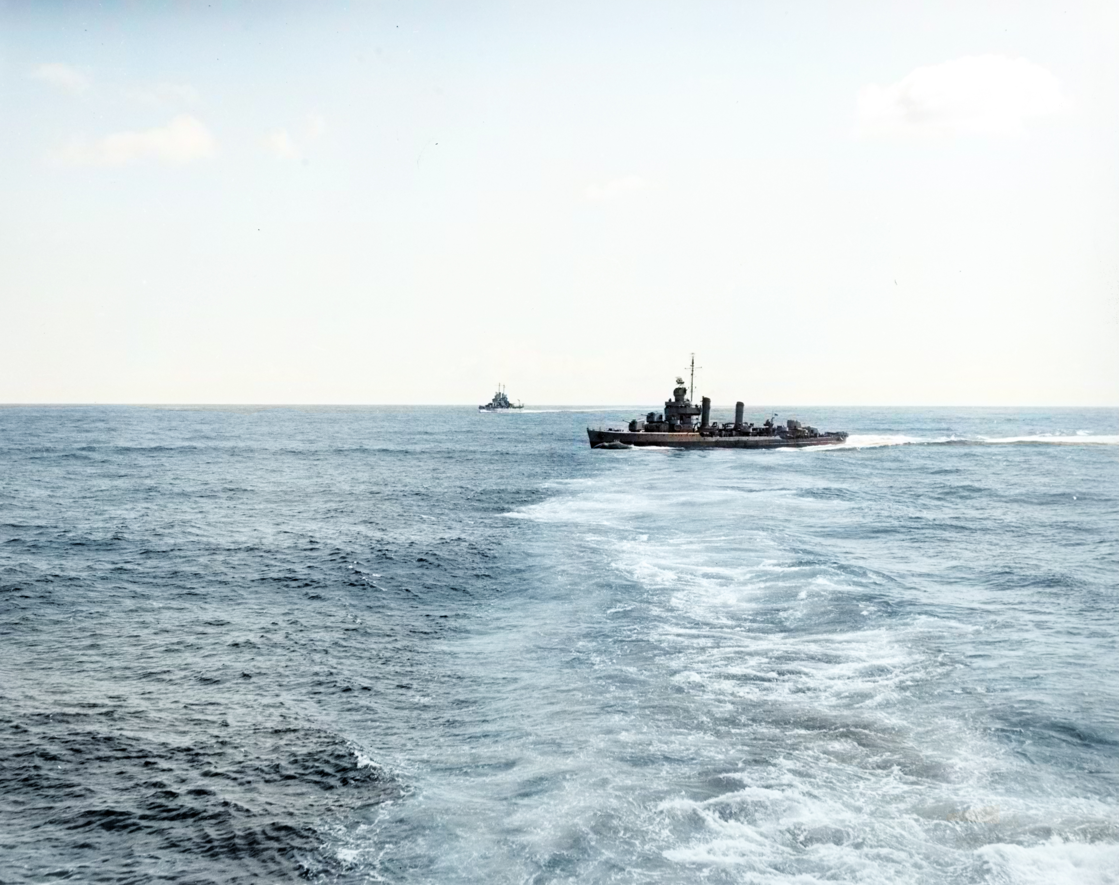 USS Swanson (DD 443) astern of USS Ranger (CV 4) escorting the carrier during Operation Torch Nov 1942 80 G 30225