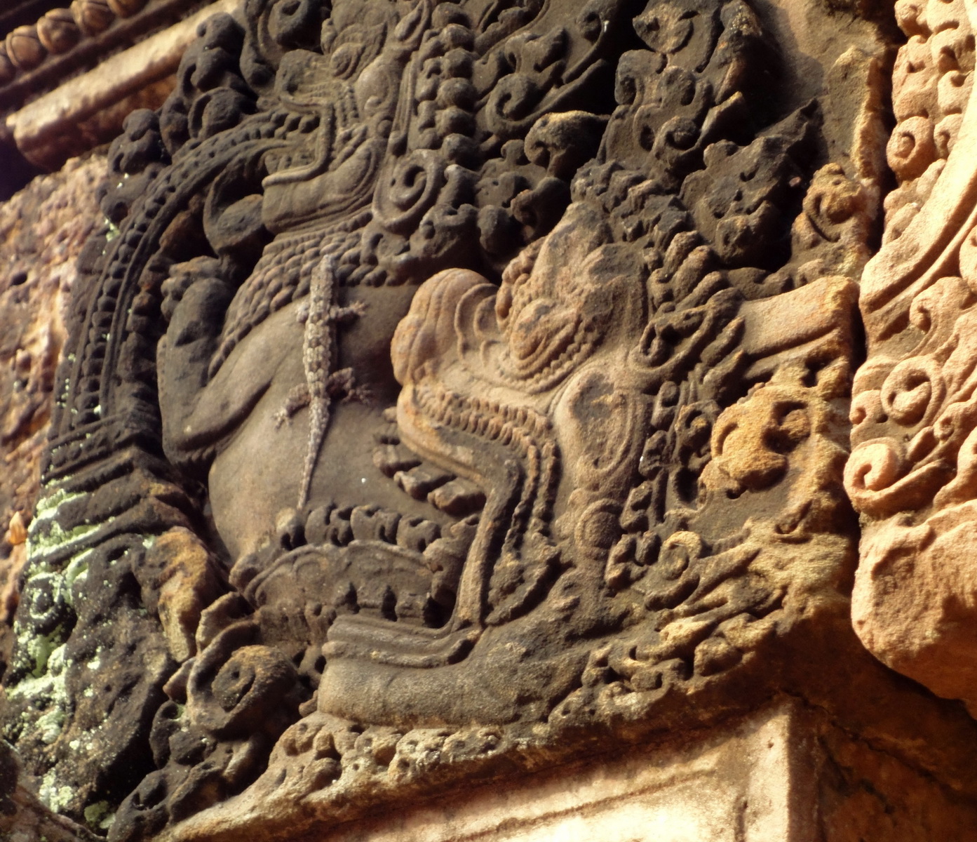 Banteay Srei red sandstone monster about to eat a Gecko 01