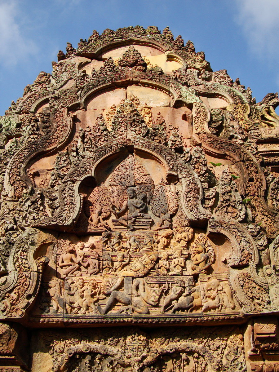 Banteay Srei red sandstone pediment shows Ravana shaking Mount Kailasa 02