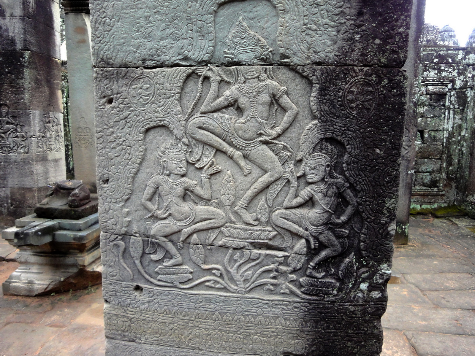 Bayon Temple Bas relief pillars three dancing apsaras Angkor 02