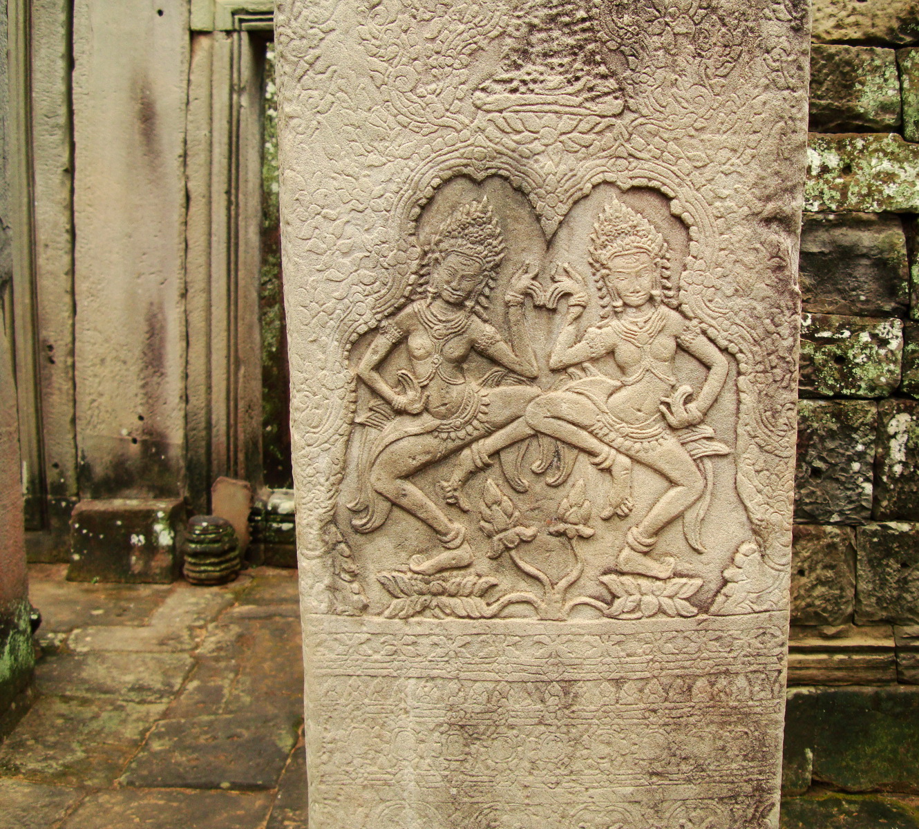 Bayon Temple Bas relief pillars two dancing apsaras Angkor 16