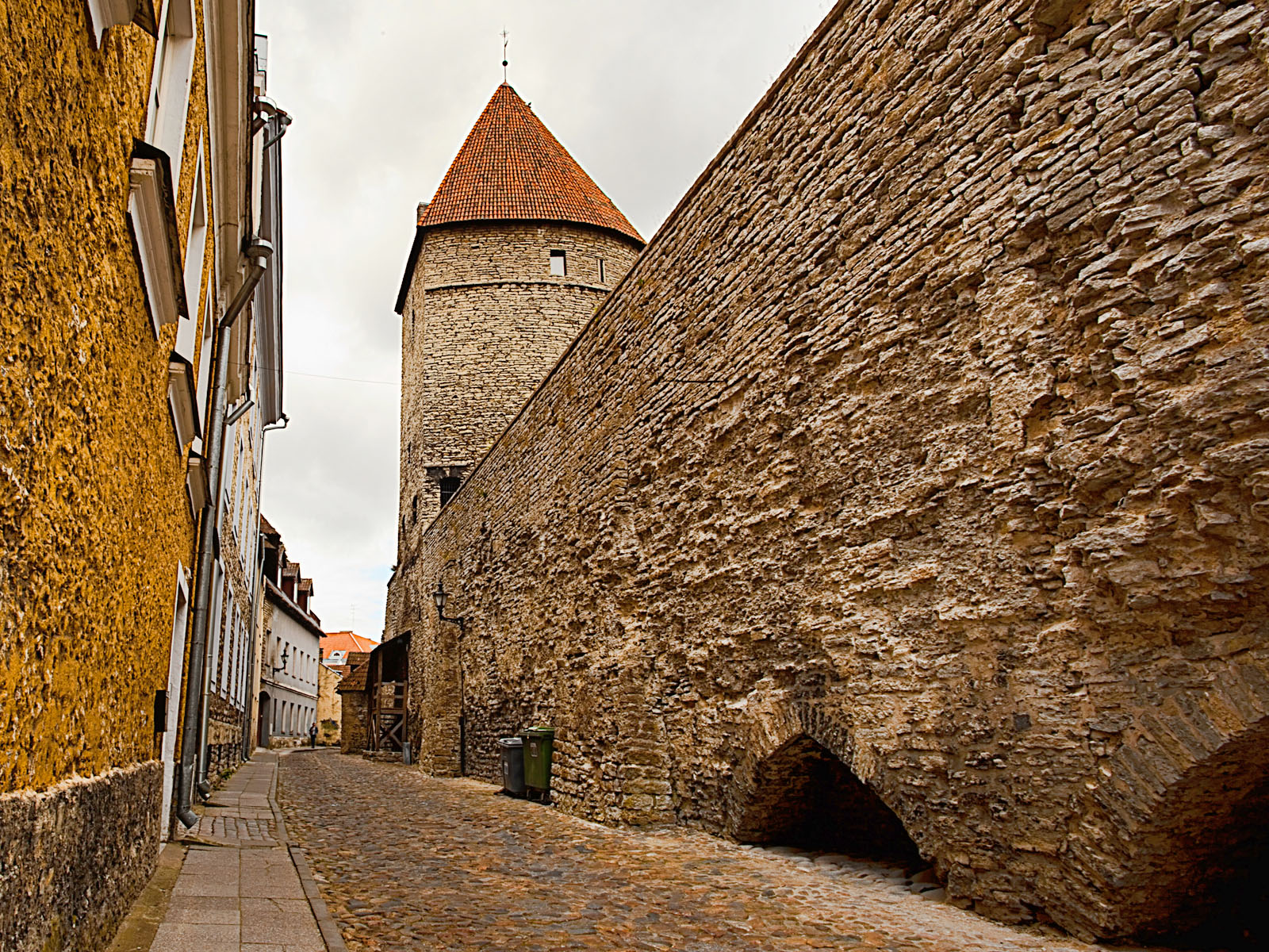 Guard tower and castle walls encasing the old medieval city of Tallinn Harju Estonia 01
