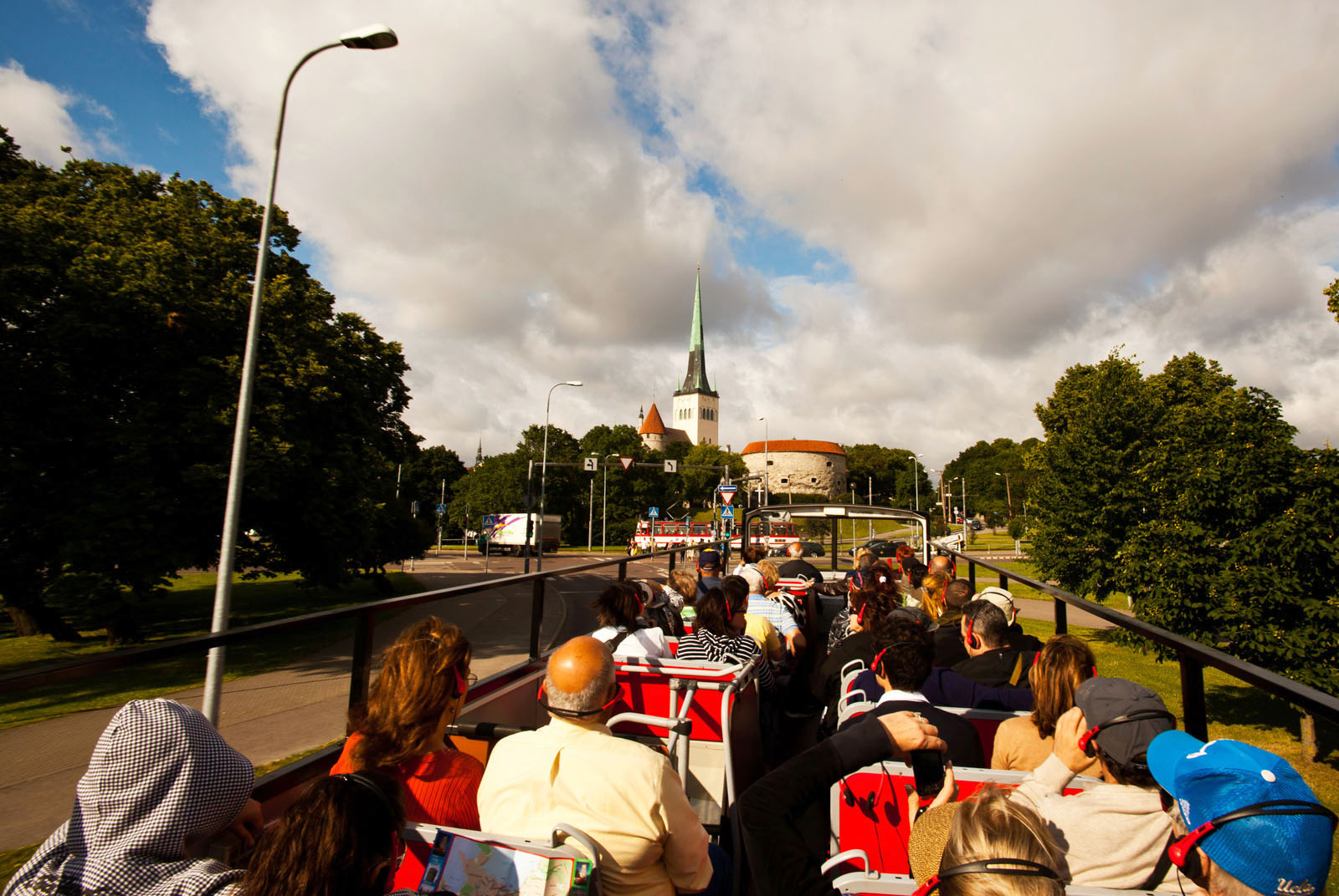 Tallinn hop on hop off bus city tour background St Olafs Church viewed from Mere puiestee Tallinn 01