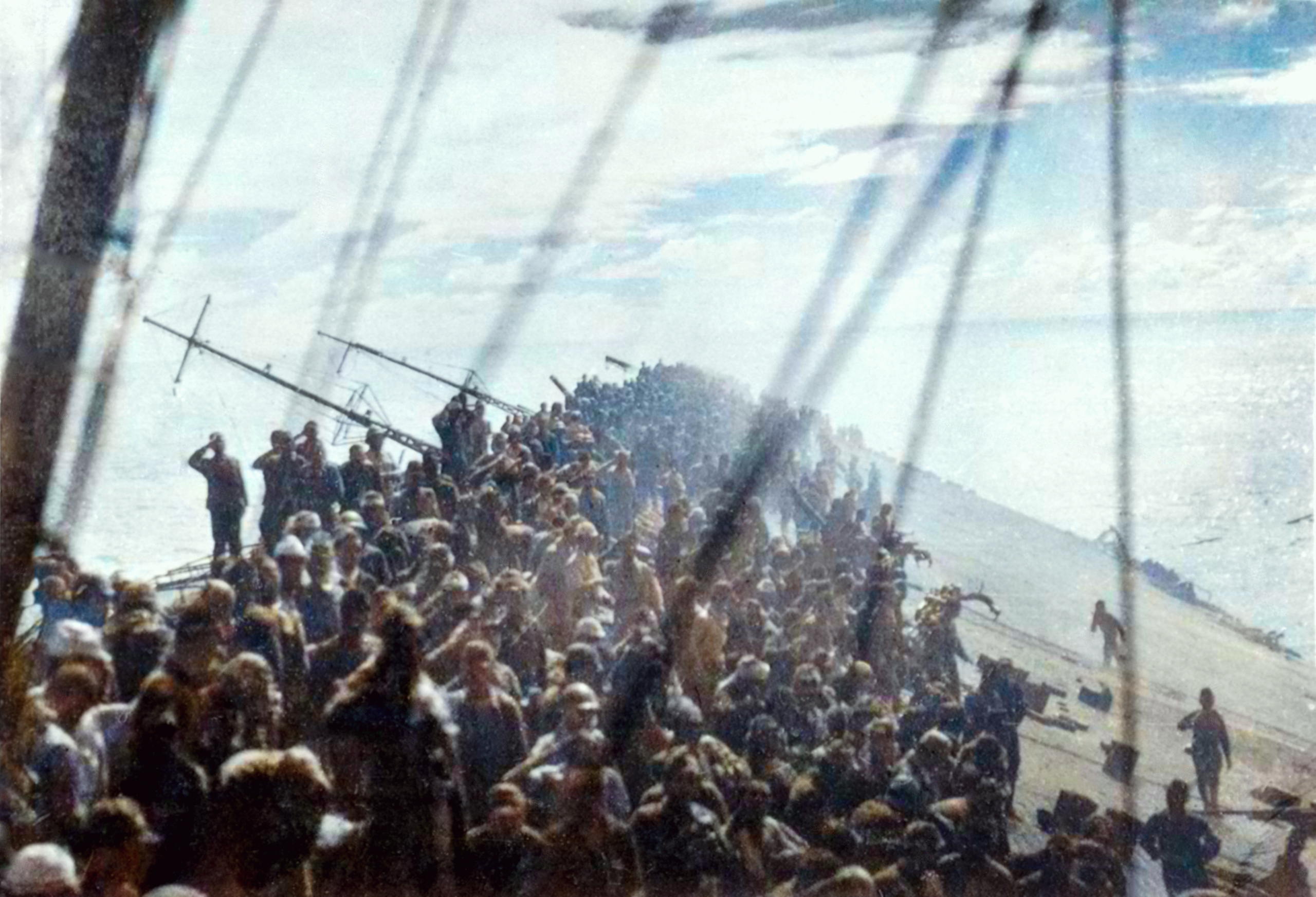 Well disciplined crew of the sinking Zuikaku salute as the flag is lowered only half her crew were rescued 25 Oct 1944-NH 73069