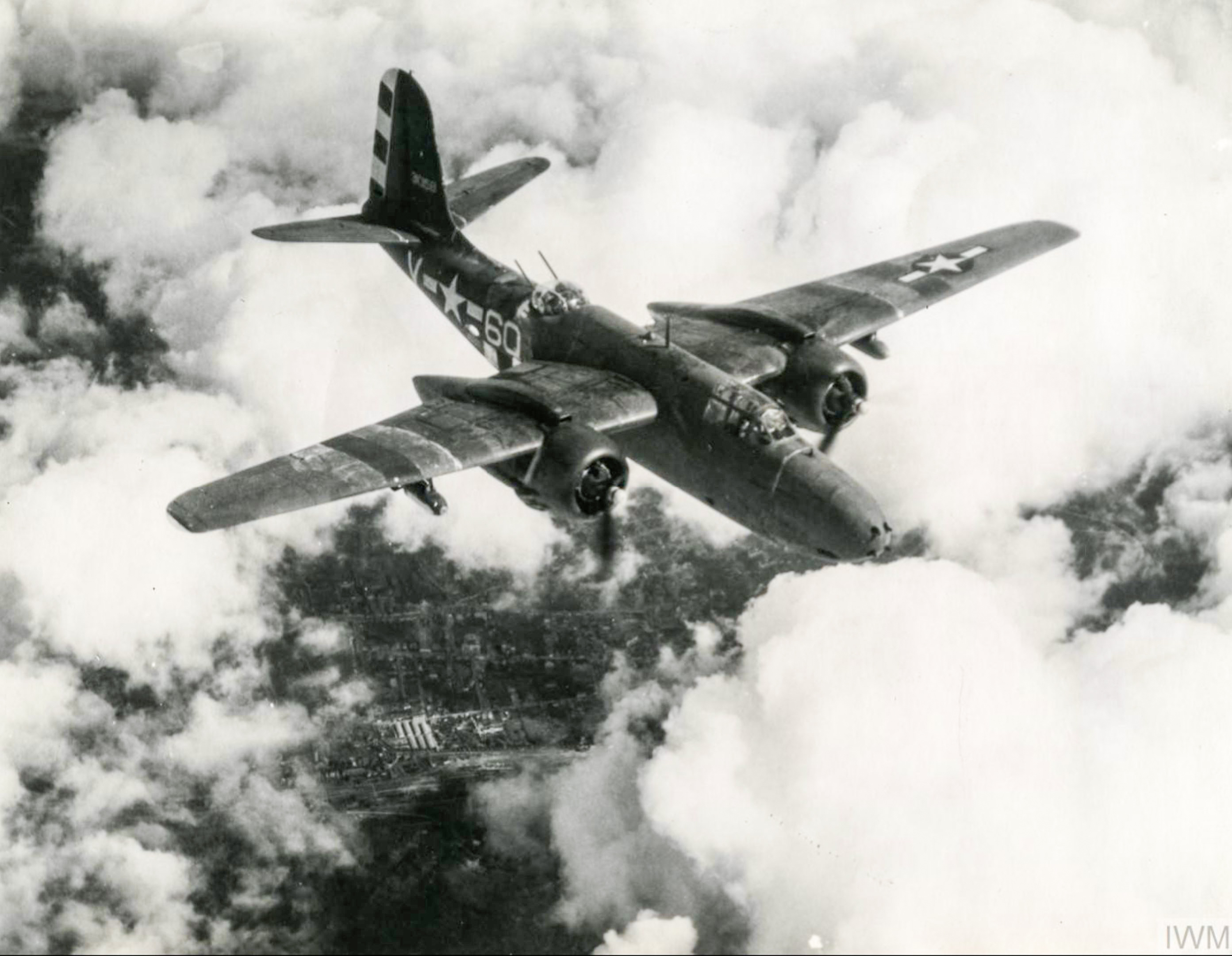 Douglas A 20G Havoc 9AF 410BG647BS 6QV in flight carrying 500 pound wing mounted bombs 1944 FRE11085
