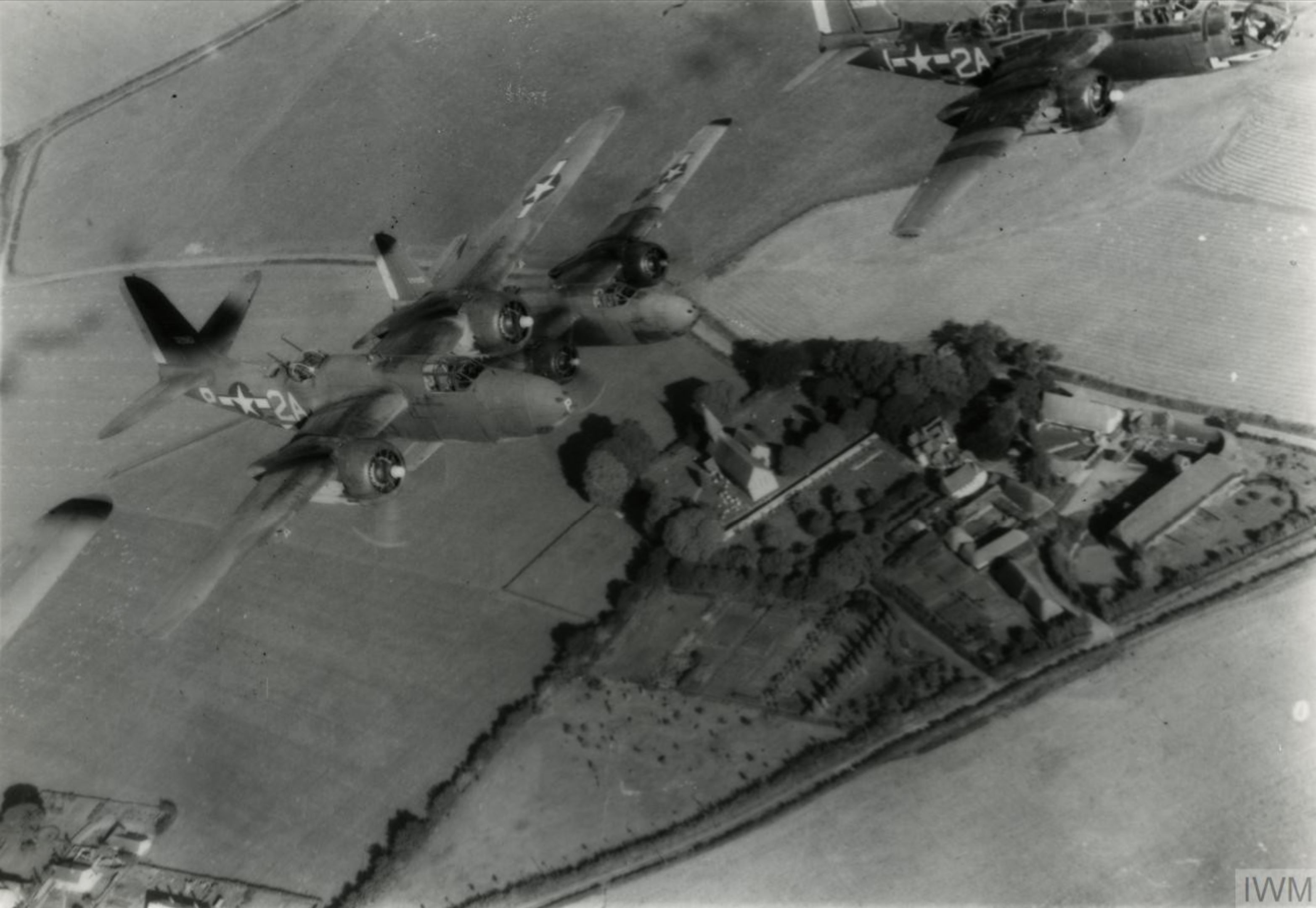 Douglas A 20G Havocs 9AF 416BG669BS with 2AP and 2AJ in formation over Broxted church Essex Sep 1944 FRE11111