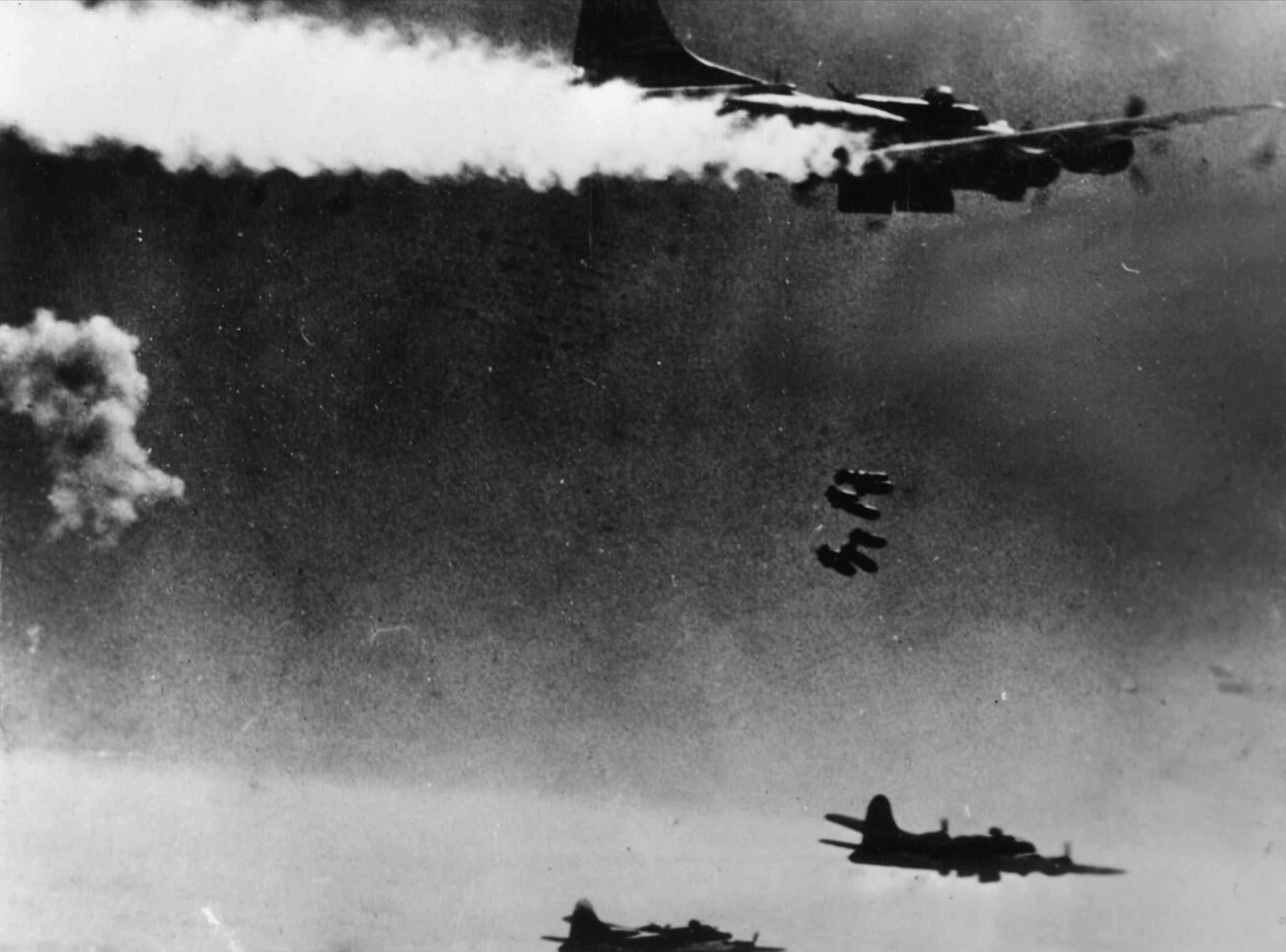 Formations of 8AF B-17 Fortresses releases its bombs over Berlin with an engine on fire FRE11660
