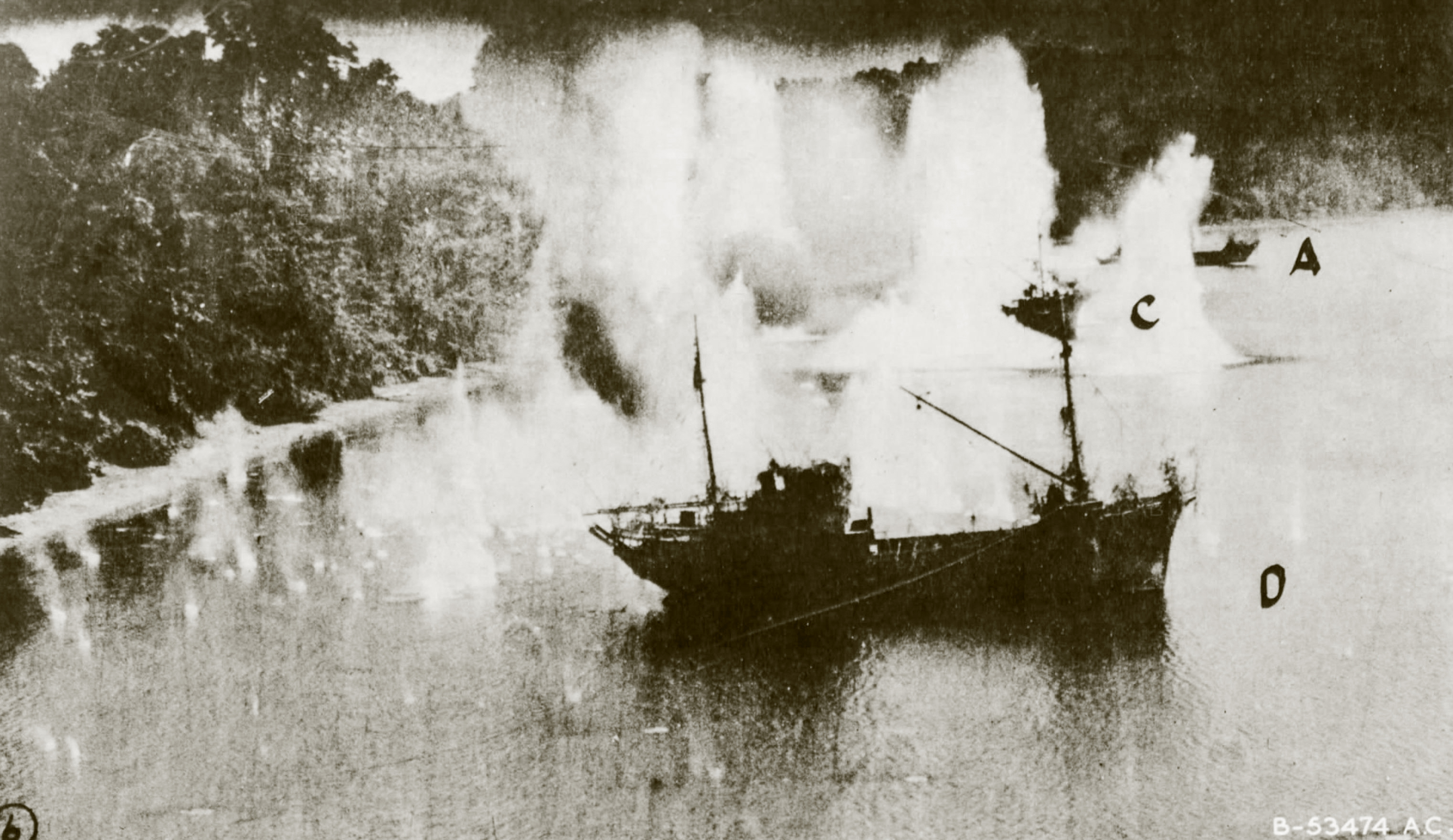 B 25 Mitchells 5AF 3BG13BS attacking IJN coastal vessels at Manokwari Dutch New Guinea 9th Jun 1944-02