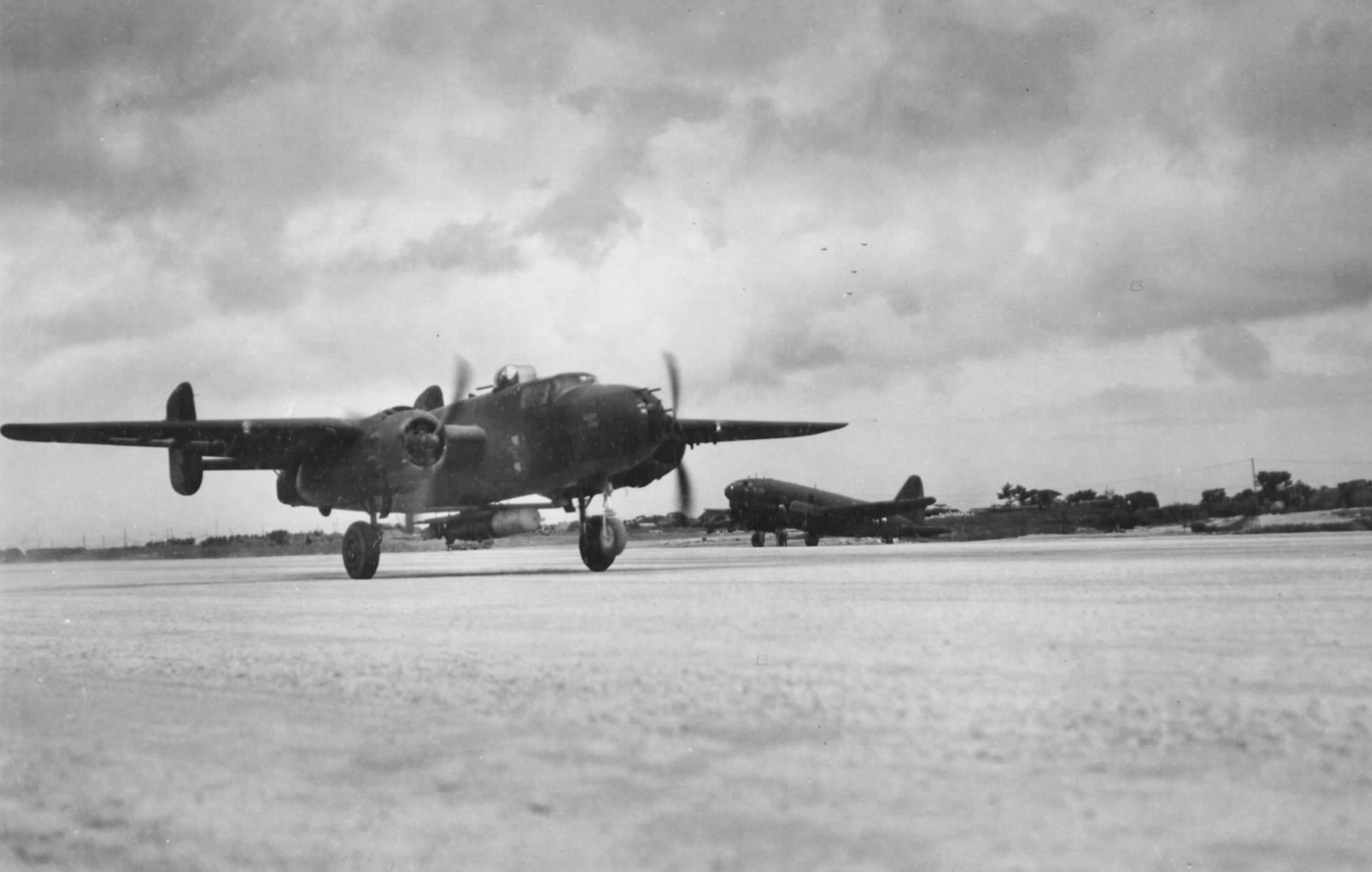 B 25 Mitchell 7AF 41BG47BS at Okinawa Mk13 torpedos mission to Sasaba Harbor Japan 28th July 1945-01