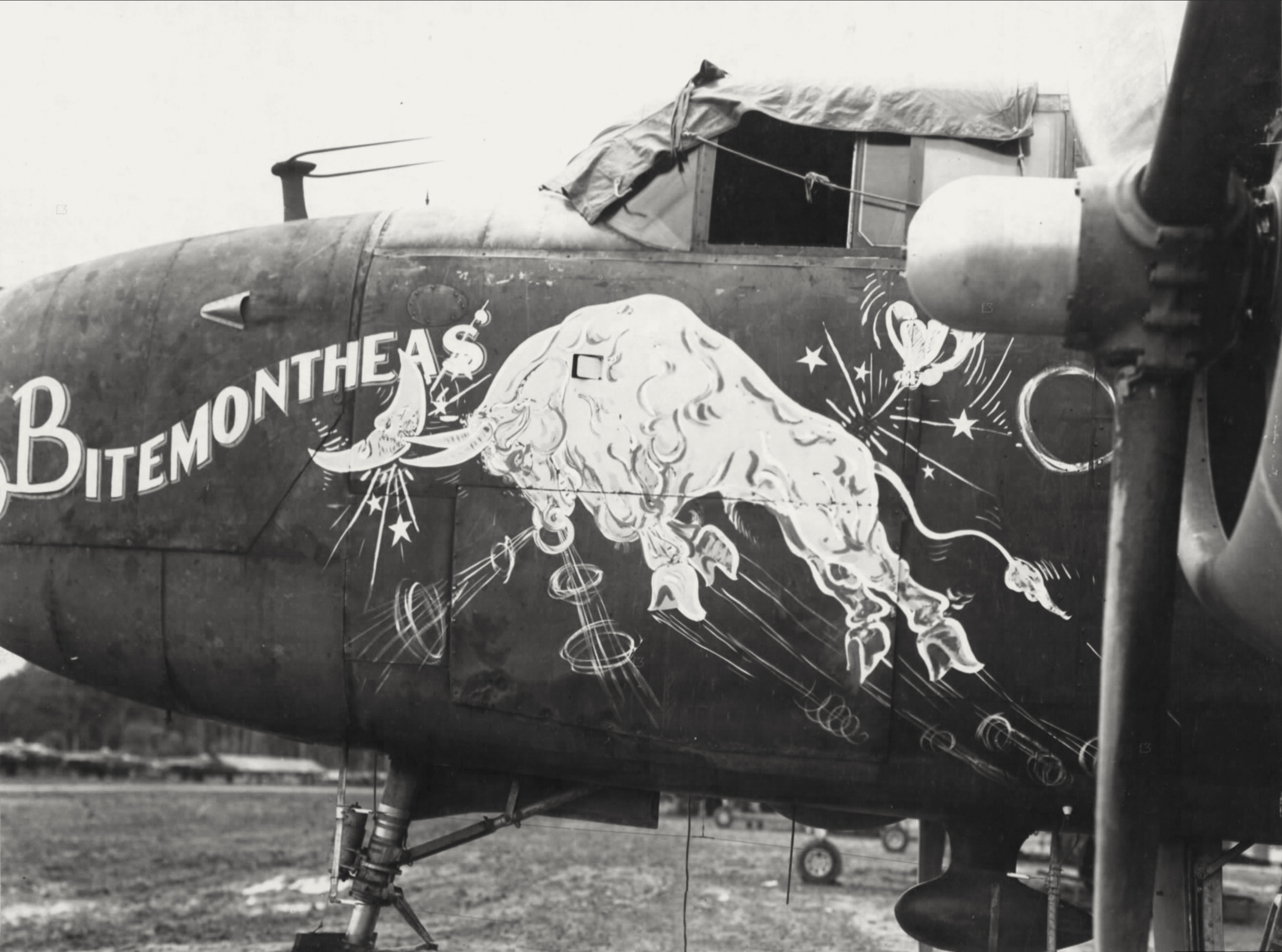 B 25J Mitchell 7AF 42BG Bitemontheas nose art left side Palawan 23rd July 1945 01