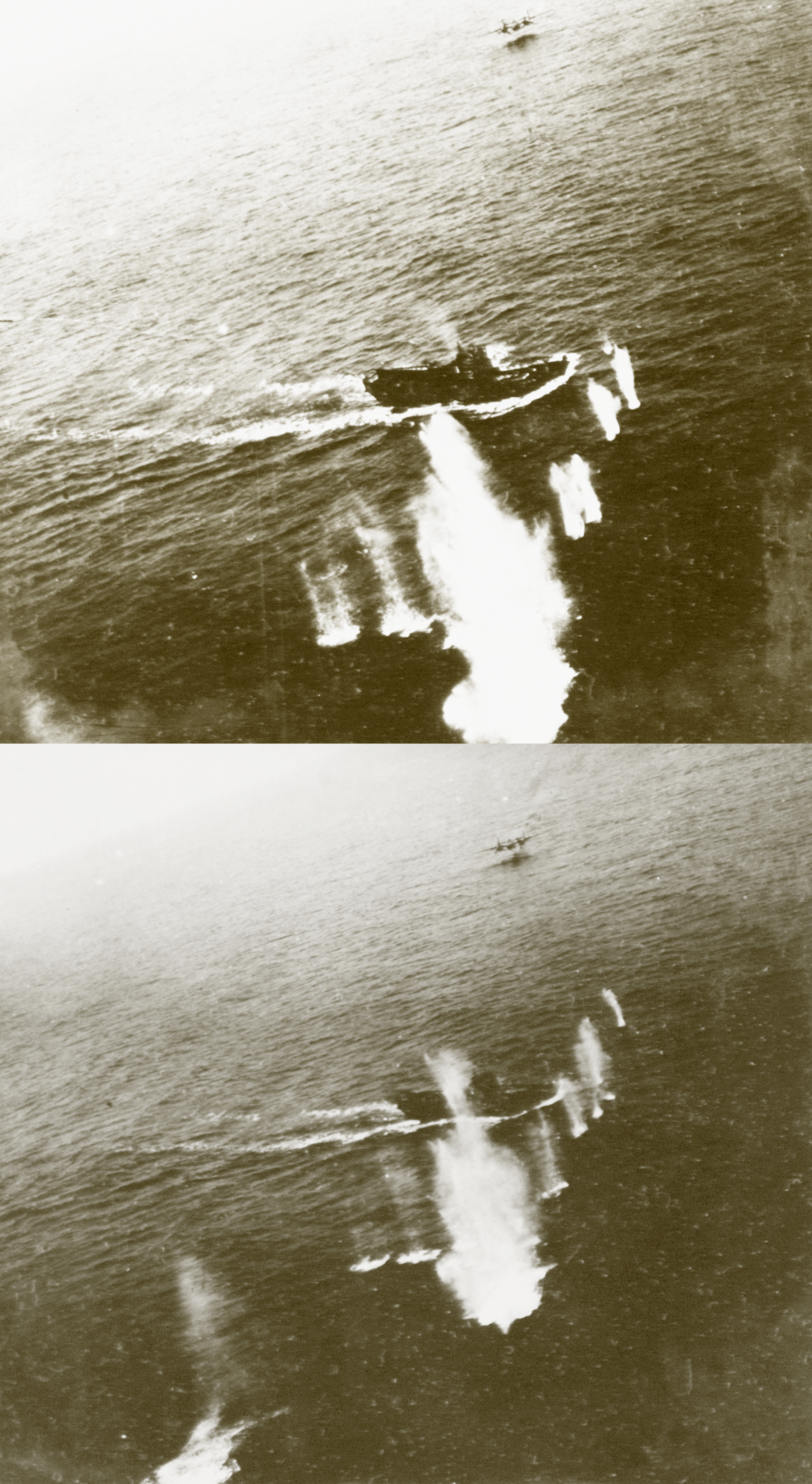 B 25 Mitchell 11AF low level strafing of a Japanese Picket boat off Paramushiru Kurile Isls Jun 1945-02