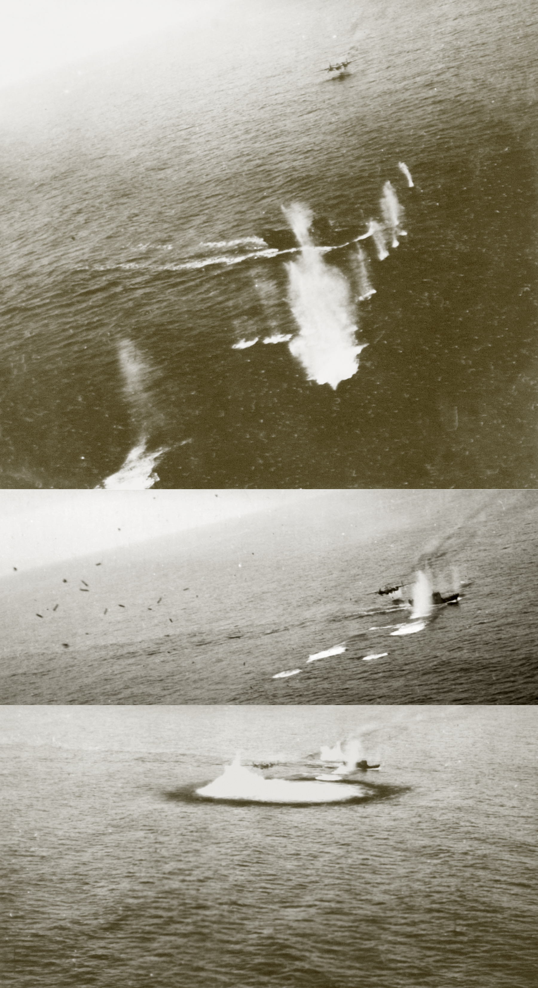 B 25 Mitchell 11AF low level strafing of a Japanese Picket boat off Paramushiru Kurile Isls Jun 1945 03