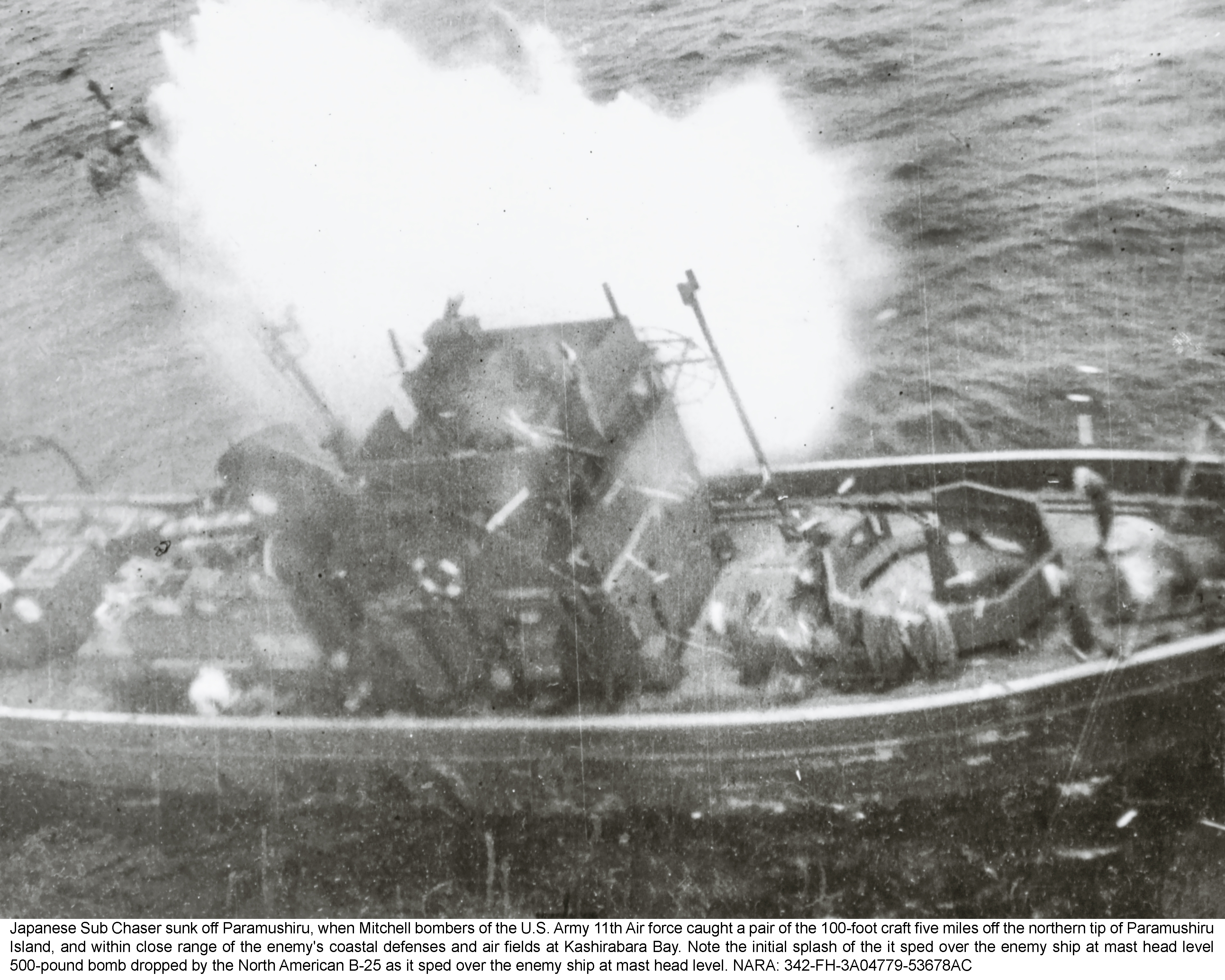 B 25 Mitchell 11AF low level strafing of a Japanese Sub Chaser off Paramushiru Kurile Isls Jun 1945-NA1017