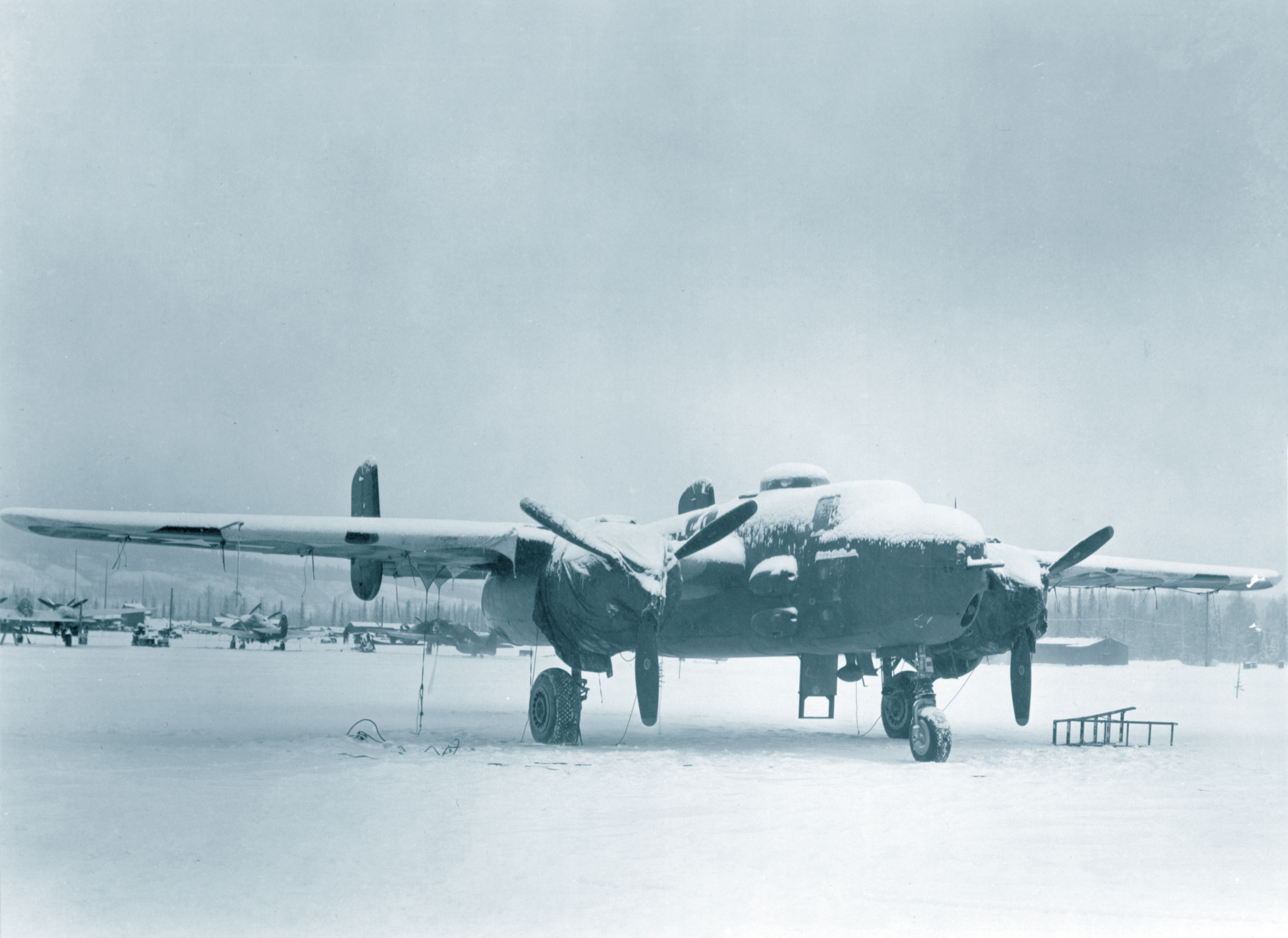 B 25G Mitchell during a snowstorm at Ladd Field Alaska 15th Feb 1944-NA1094