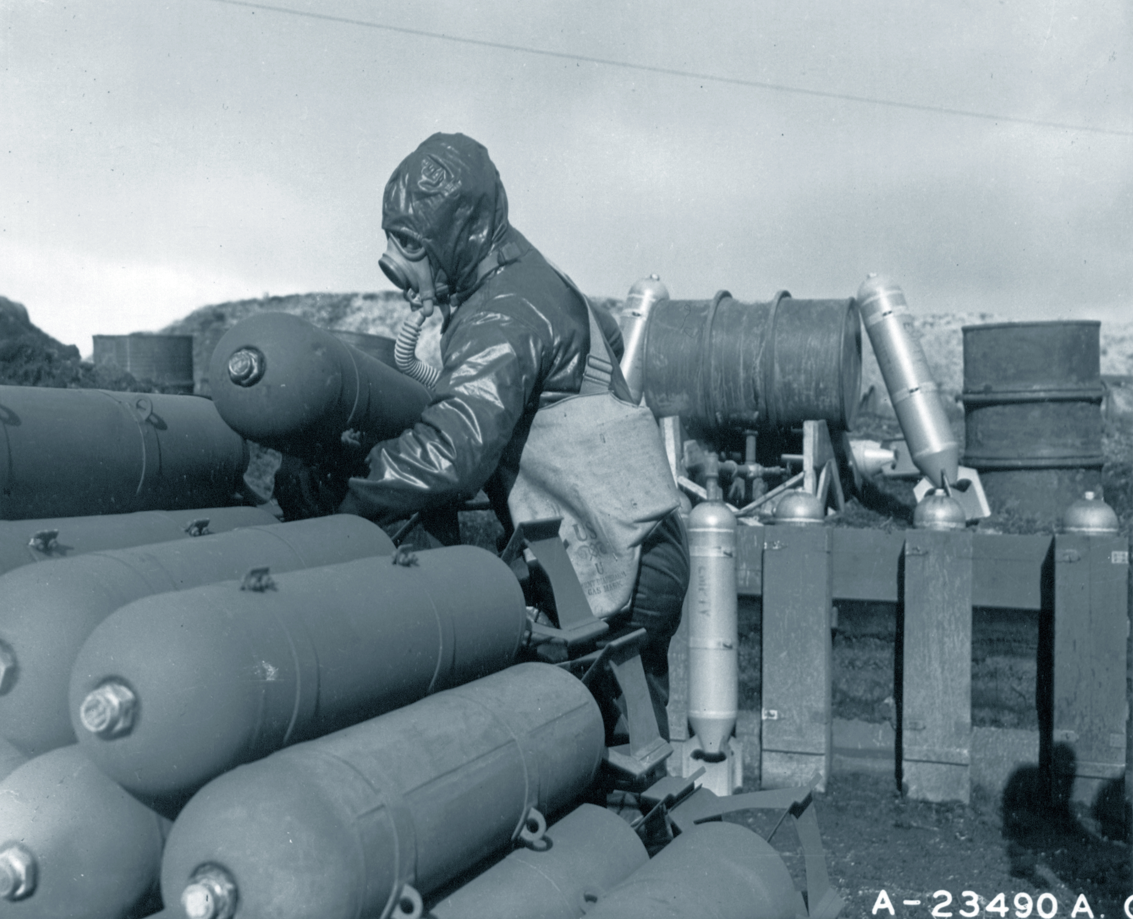 USAAF chemical sulphur trioxide bombs being stacked on a base Aleutian Island 1943-NA1251