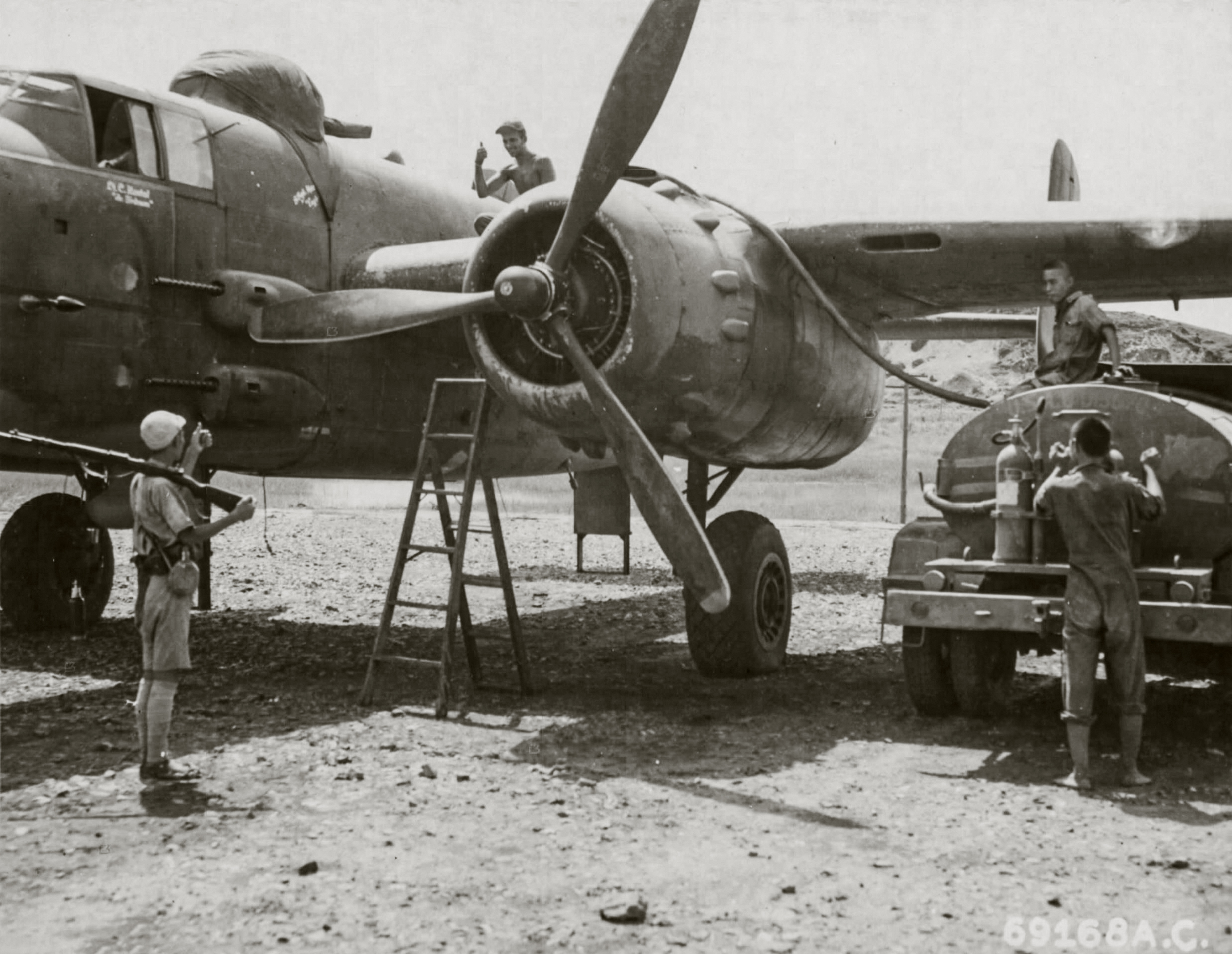 B 25 Mitchell from The Green Hornets being refueled at Kwanghan airfield China 2nd Aug 1944-01