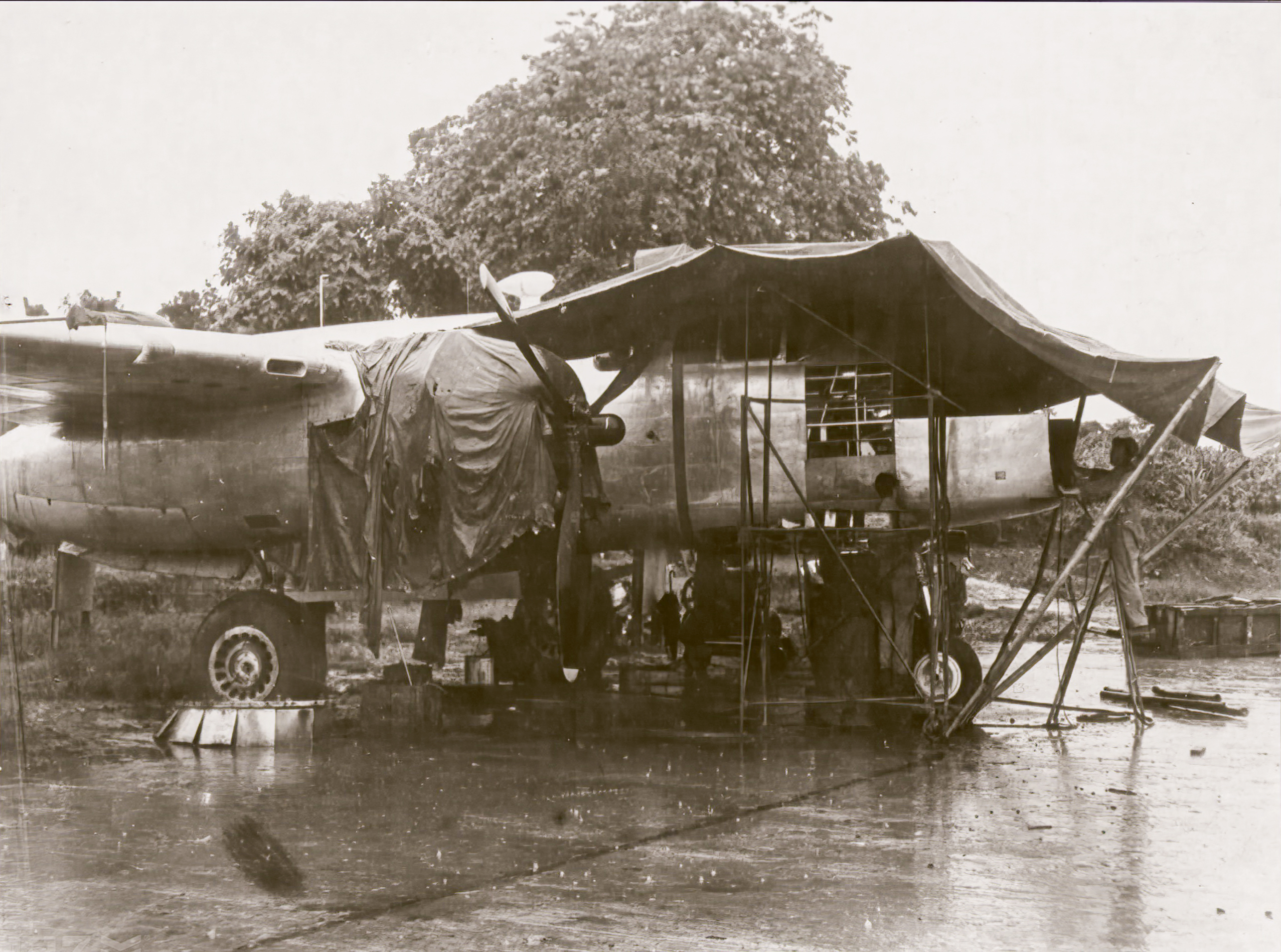 B 25 Mitchell under going repairs during a monsoon downpour 12th Oct 1944 01