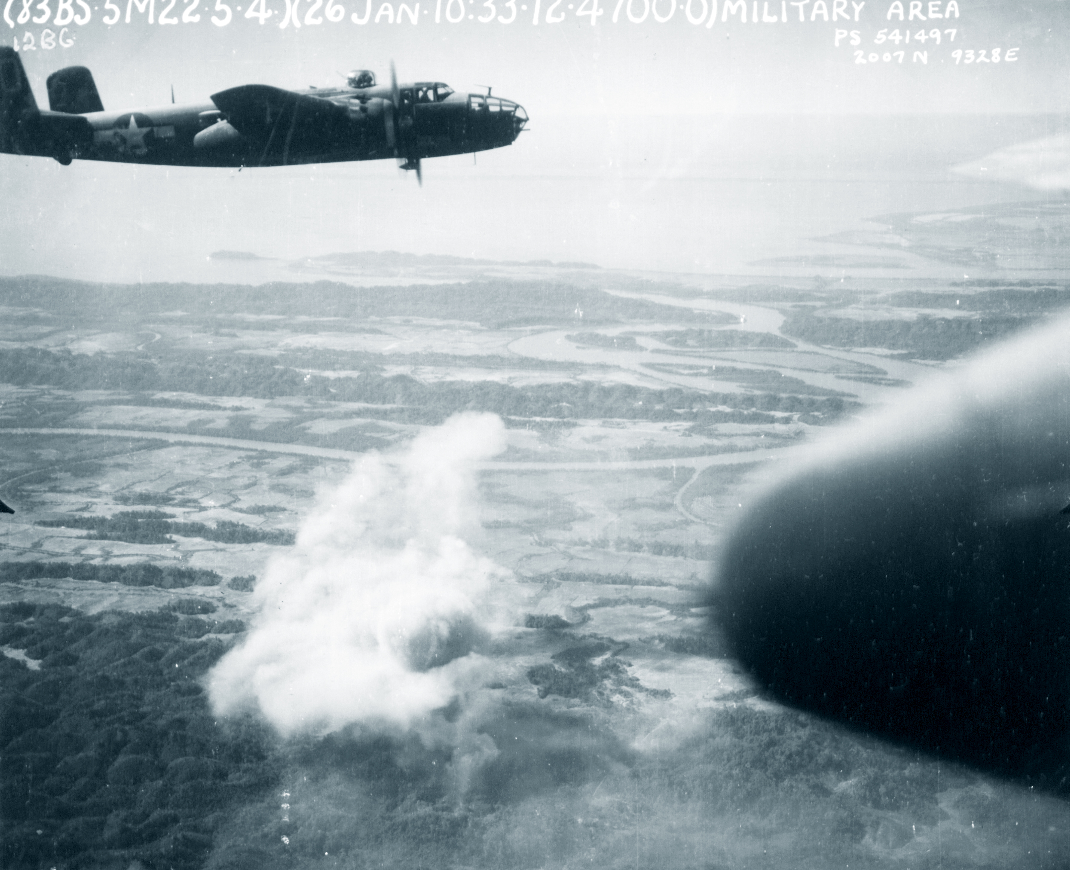 Target 10AF 12BG83BS B 25 Mitchell leave after bombing Kinu near Akyab Burma 26th Jan 1945 NA331