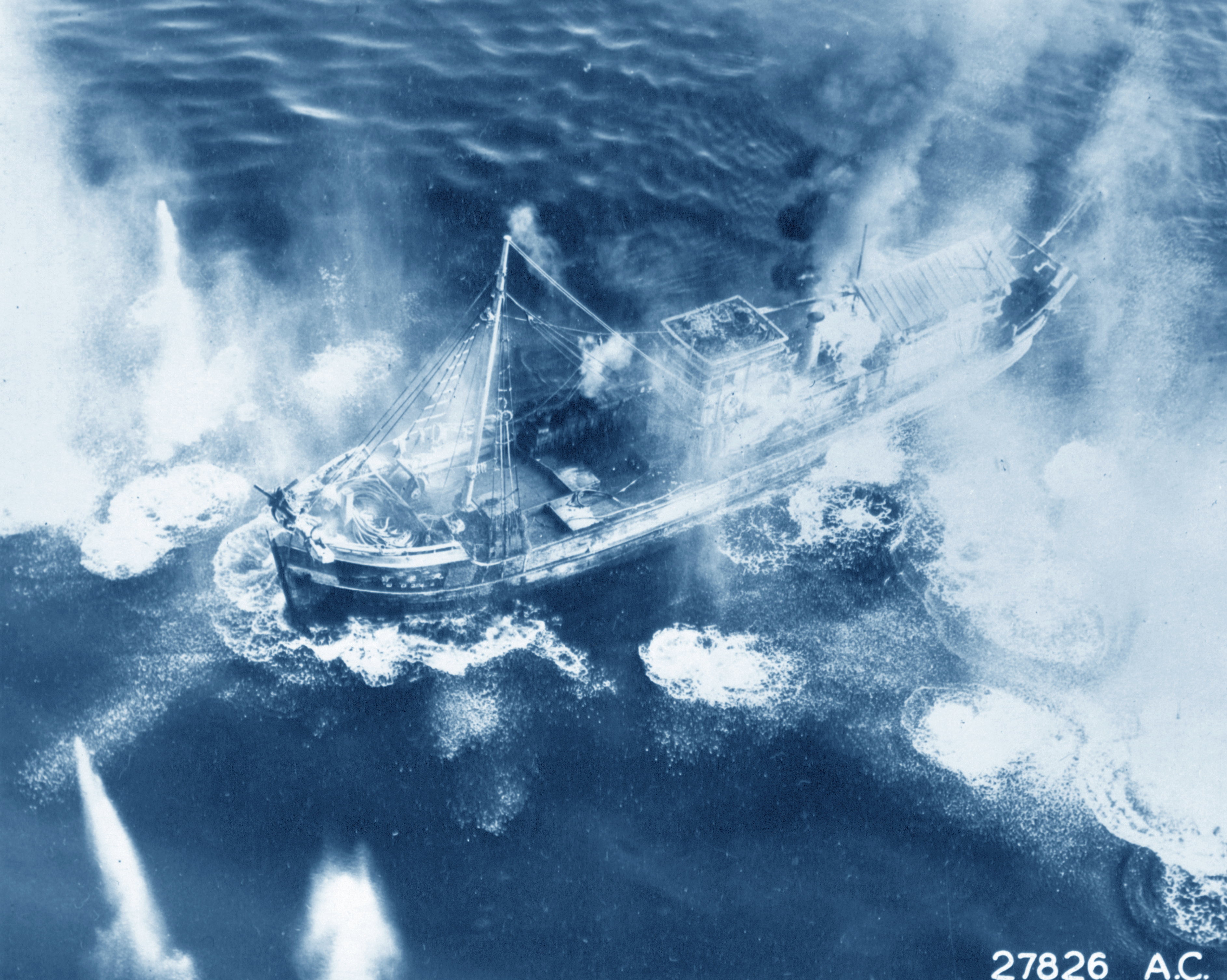 Target 10AF aircraft blanketing a Jap freighter with direct hits in the Andaman Sea at Mergui Burma NA578