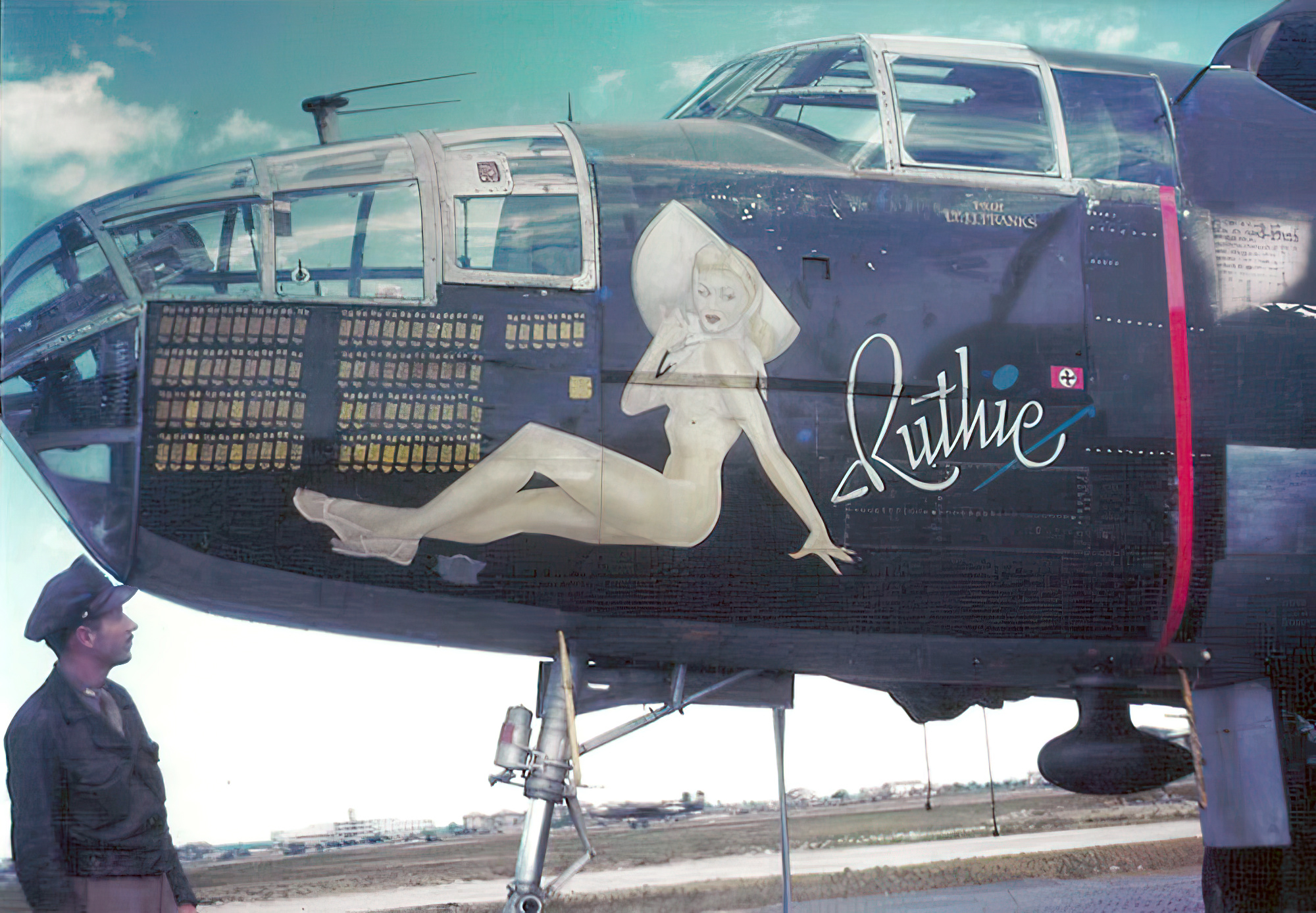 43-27653 B 25J Mitchell 12AF 340BG489BS Briefing Time Ruthie nose art left side 01