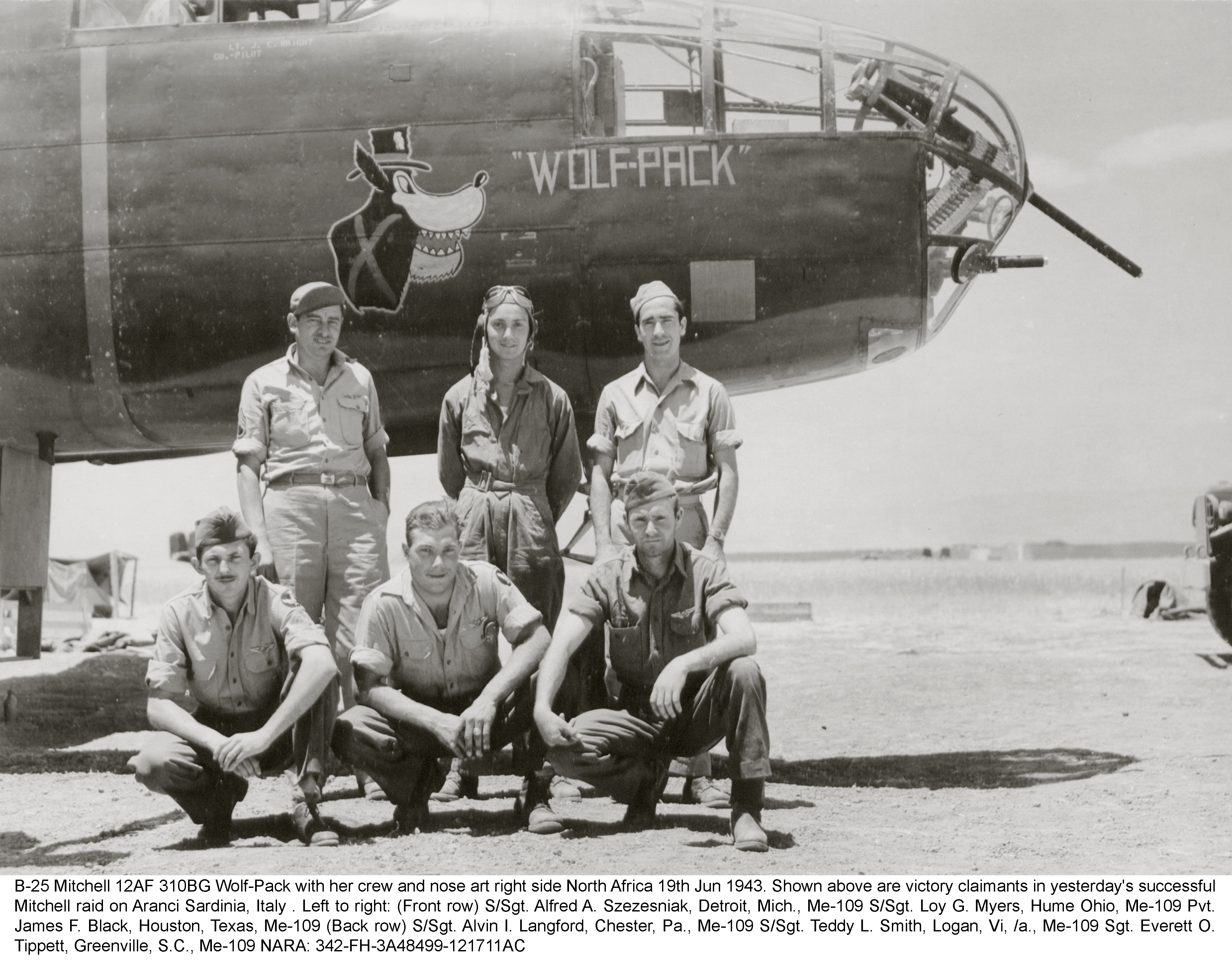 B 25 Mitchell 12AF 310BG380BS Wolf Pack with her crew and nose art right side North Africa 19th June 1943-01