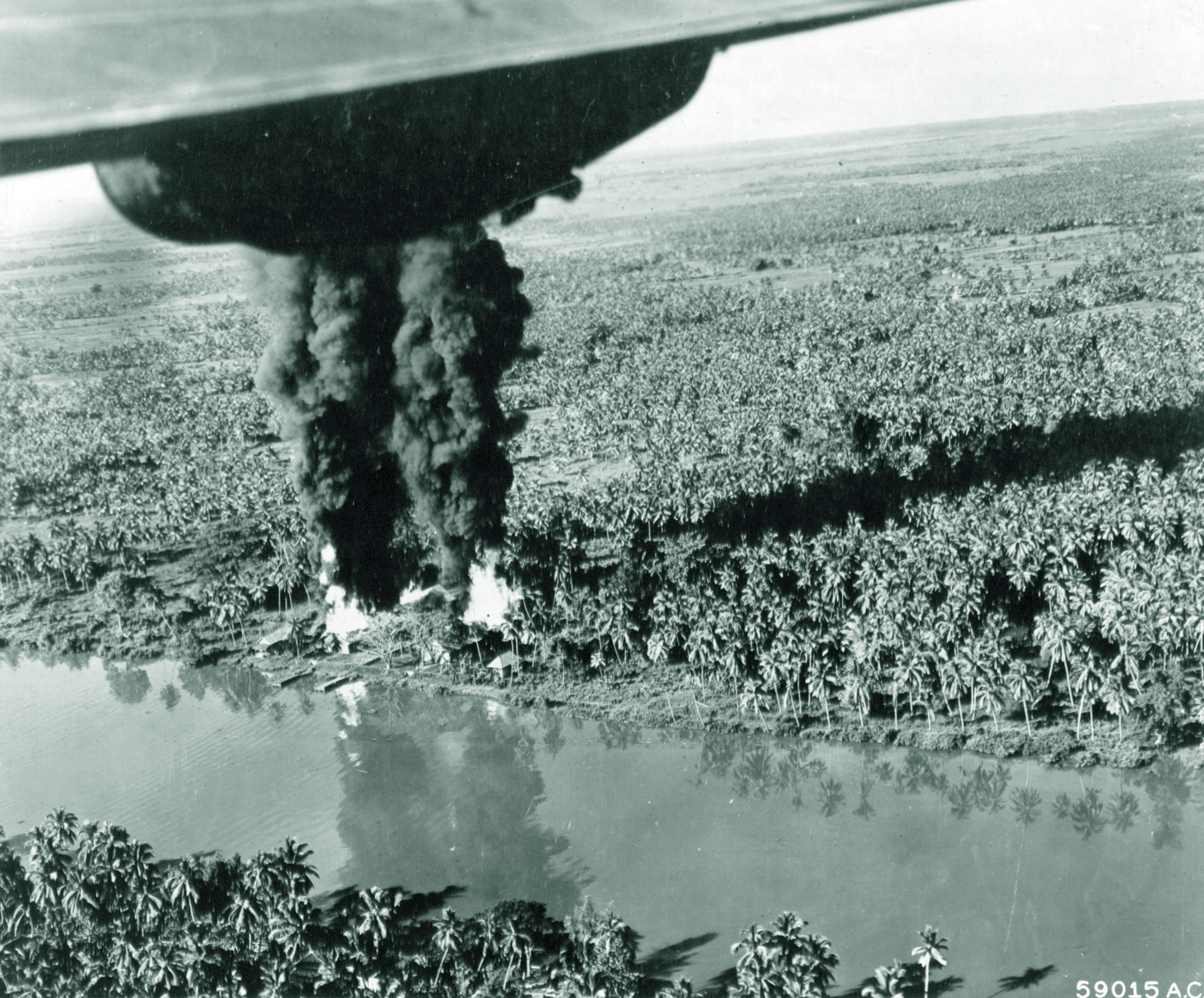 13AF destroy barge fuel hidden along Borneo jungle waterway near Bandjermasin South Kalimantan Indonesia 1945 NA360