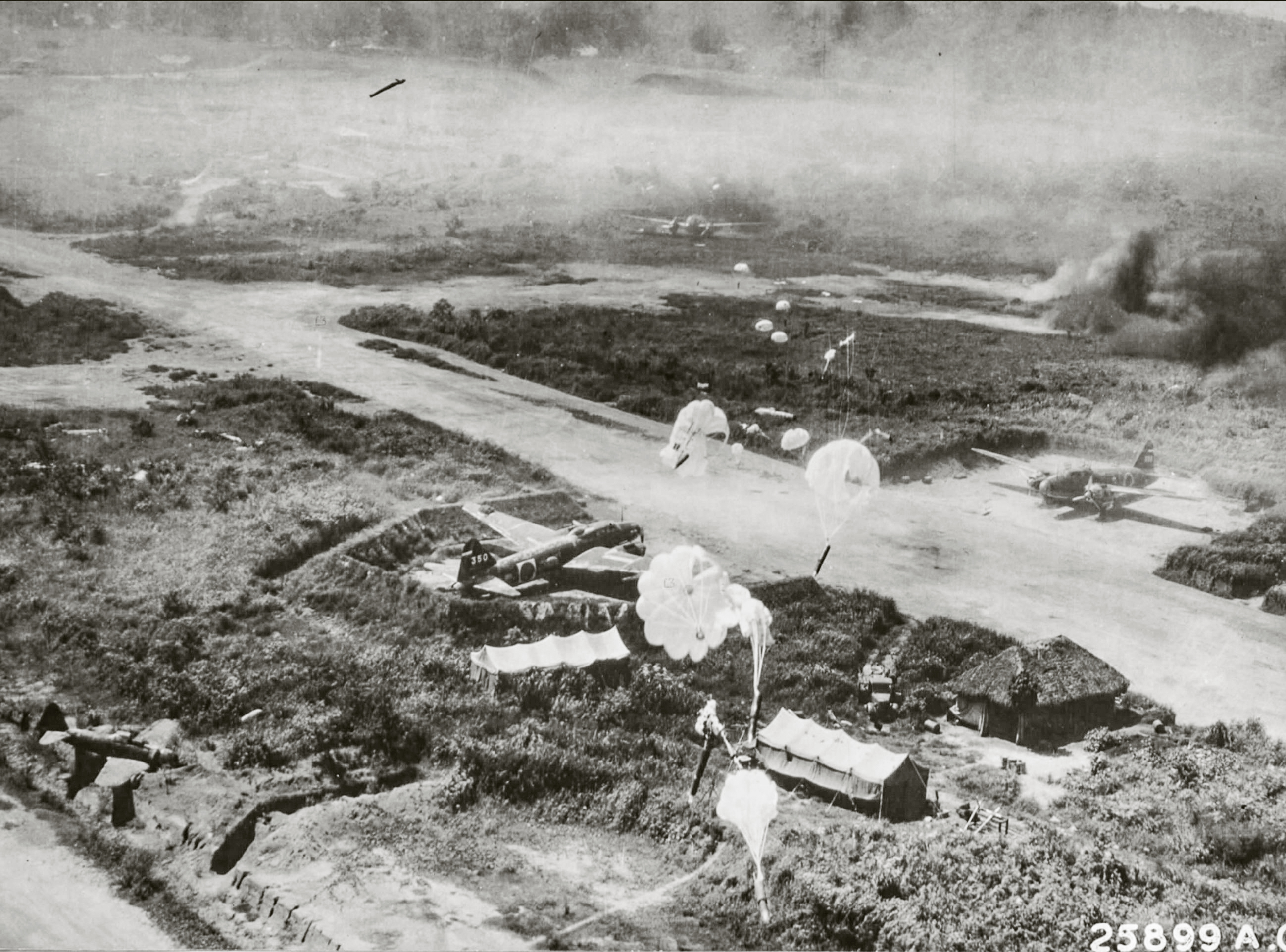 5AF B 25 Mitchells Parachute bombing of Mitsubishi G4M betty at Vunakanau Airdrome Rabaul New Britain 12th Oct 1943-01