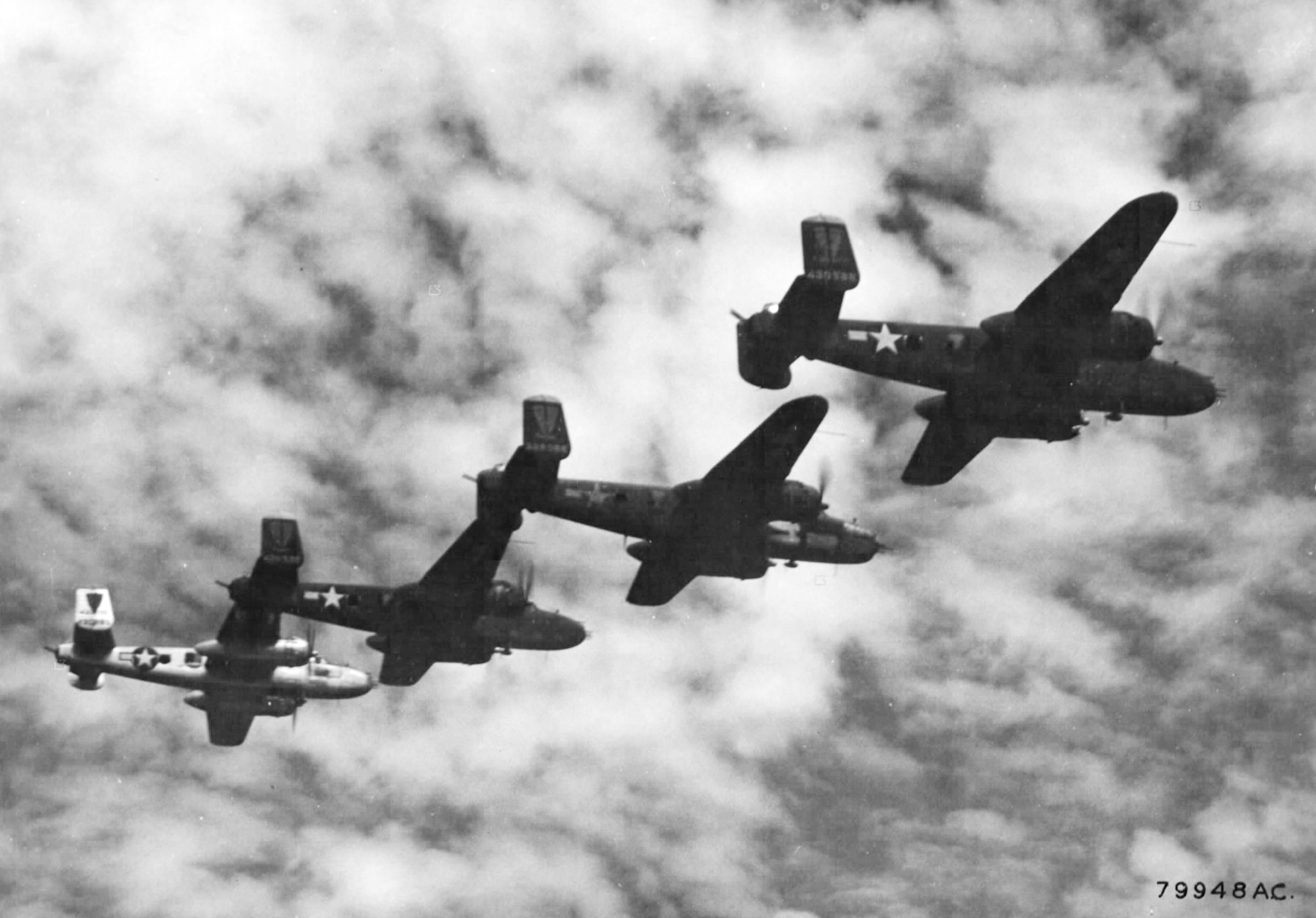 B 25 Mitchell 13AF Crusaders low level strafing attacks on Balikpapan's defenses Borneo Aug 1945 01