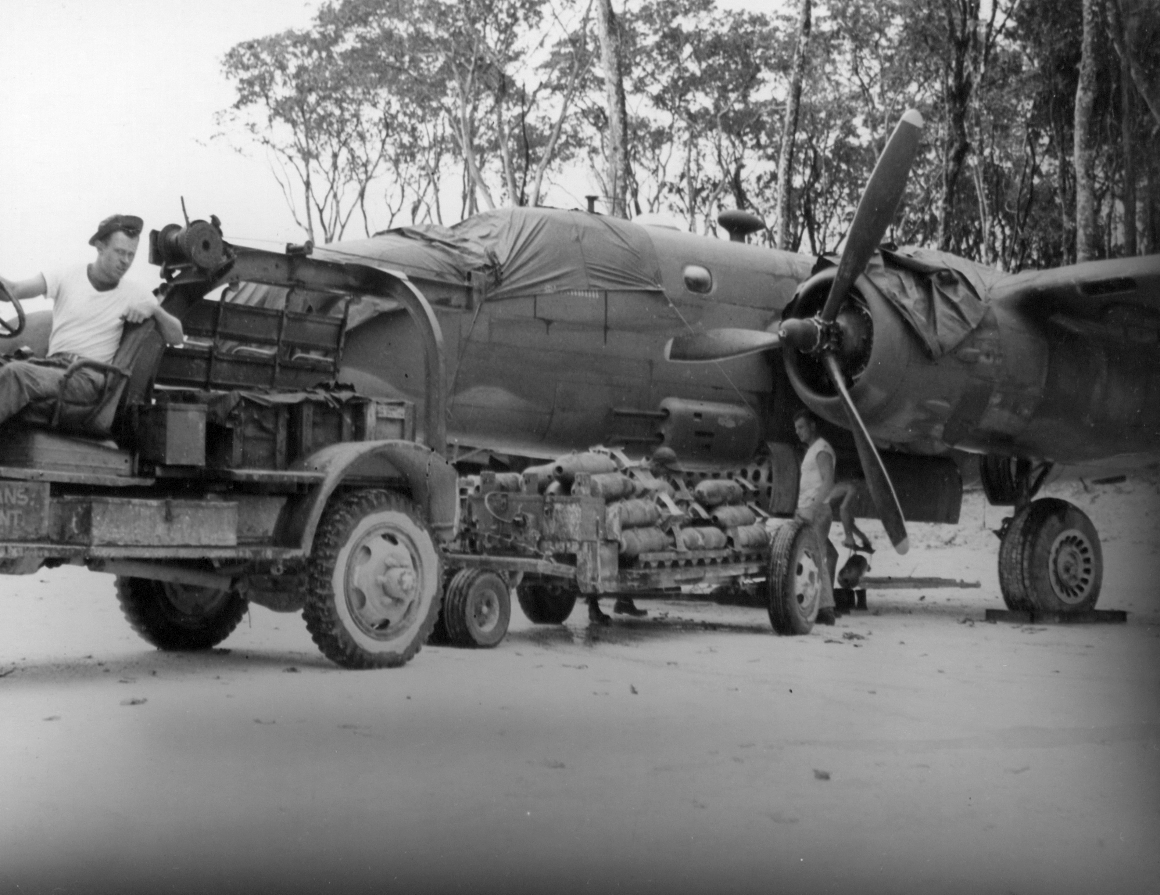 B 25 Mitchell being loaded with One hundred pound demolition bombs Pacific 1943 NA885