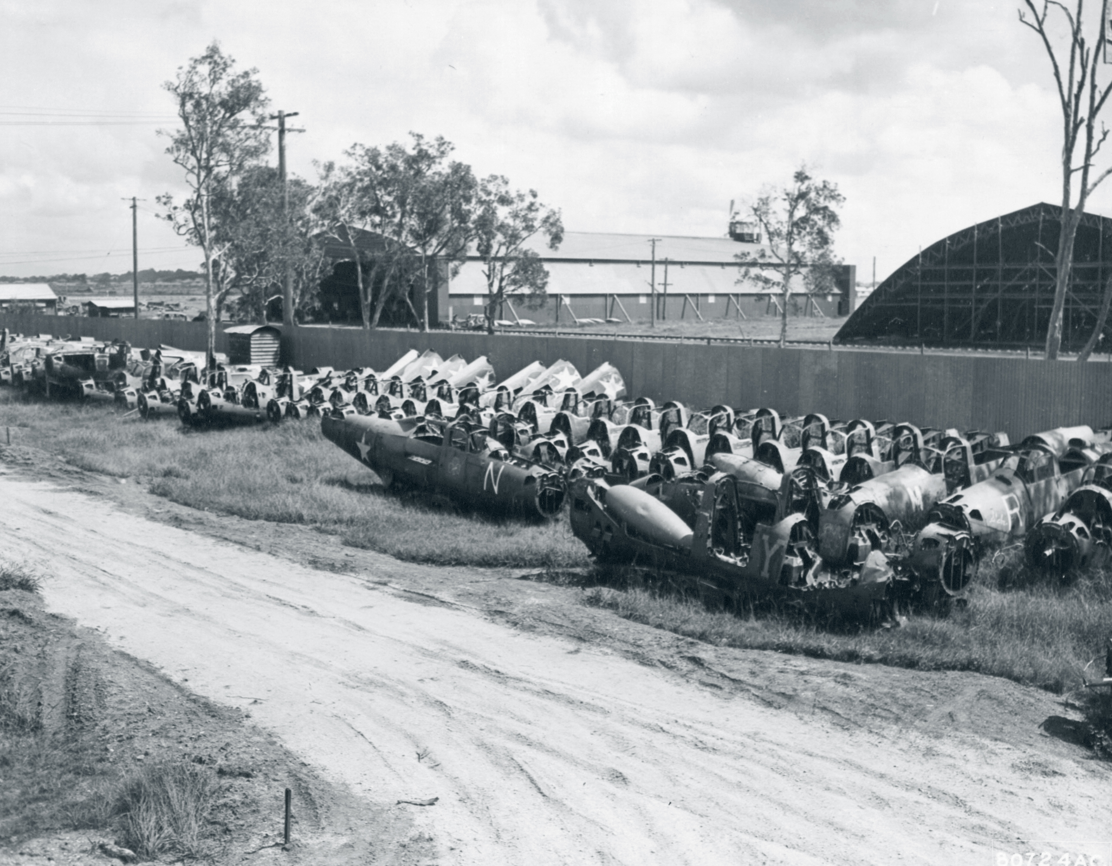 Wrecks of various US aircraft piled up for salvage at Eagle Farm Brisbane Australia 4th Mar 1943 NA796