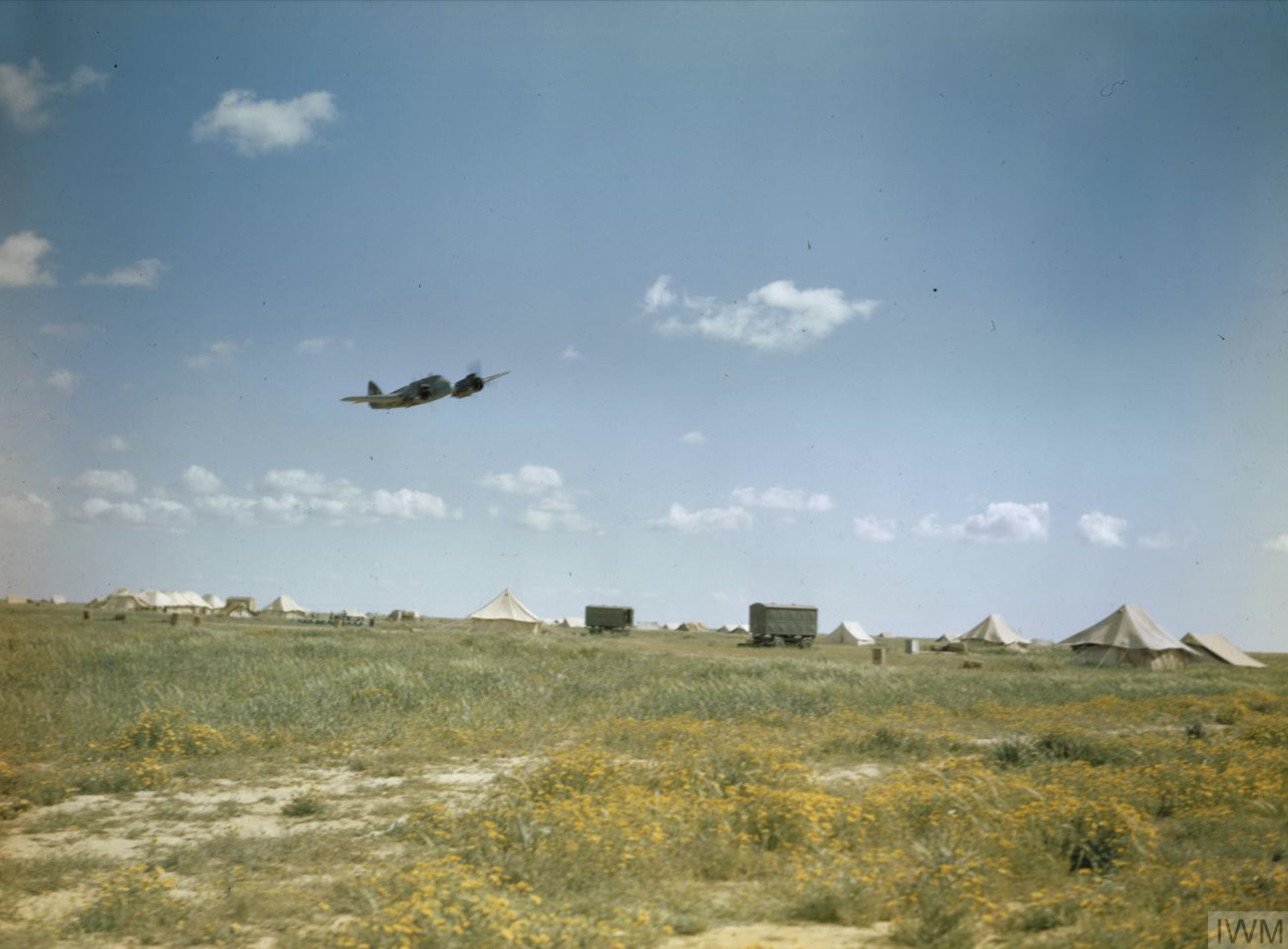 Bristol Beaufighter IF RAF 272Sqn circles a desert airfield Libya IWM TR851
