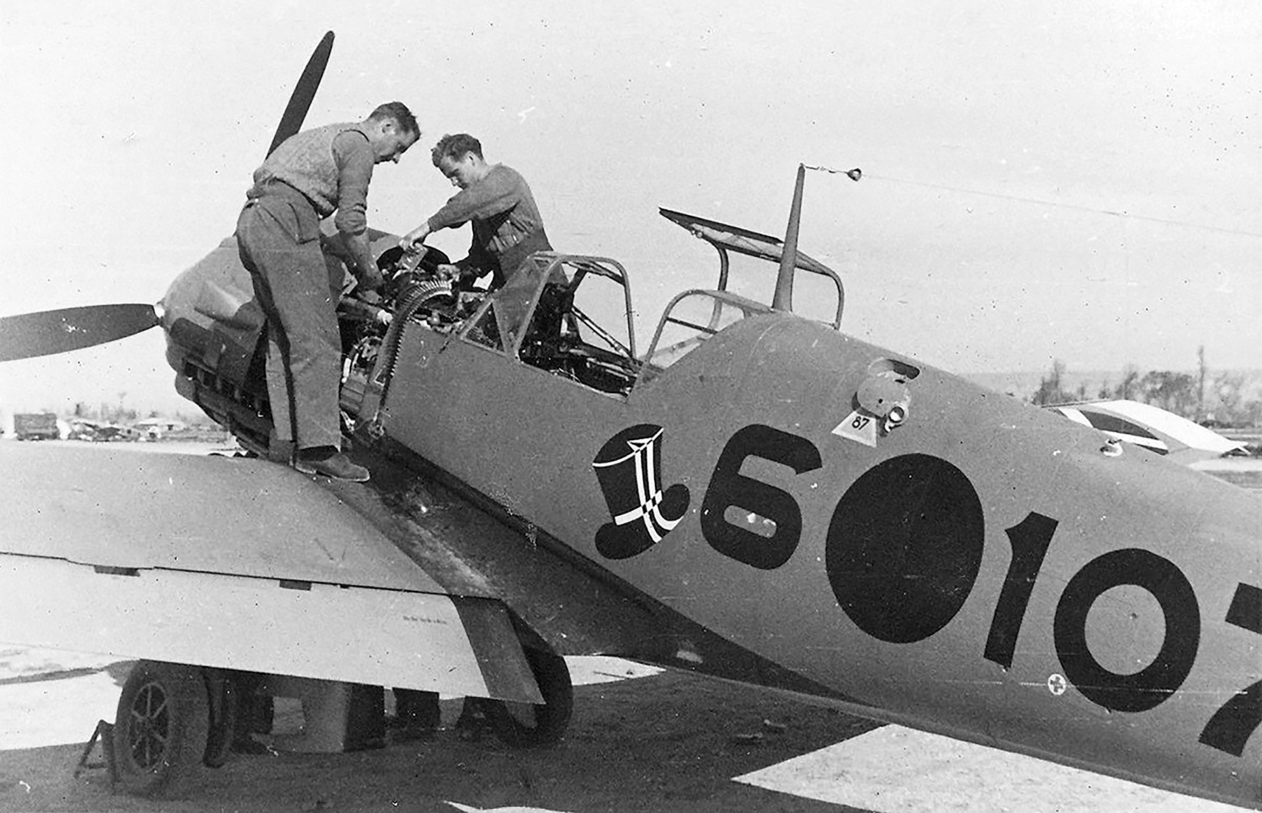 The Messerschmitt Bf 109 is a German World War II fighter aircraft that was the backbone of the Luftwaffe's fighter force. The Bf 109 first saw operational service in 1937 during the Spanish Civil War and was still in service at the dawn of the jet age at the end of World War II in 1945. It was one of the most advanced fighters of the era, including such features as all-metal monocoque construction, a closed canopy, and retractable landing gear. It was powered by a liquid-cooled, inverted-V12 aero engine. From the end of 1941, the Bf 109 was steadily being supplemented by the Focke-Wulf Fw 190. It was commonly called the Me 109, most often by Allied aircrew and among the German aces, even though this was not the official German designation.