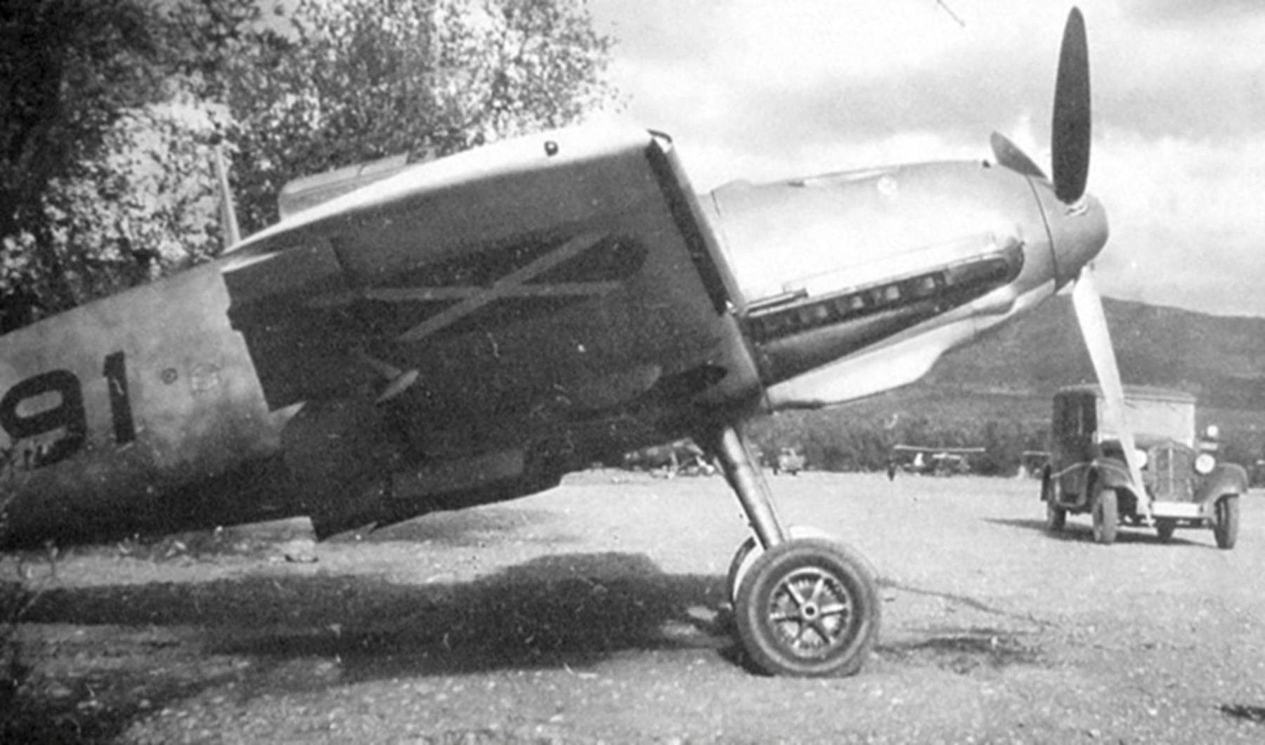 The Messerschmitt Bf 109 is a German World War II fighter aircraft that was the backbone of the Luftwaffe's fighter force. The Bf 109 first saw operational service in 1937 during the Spanish Civil War and was still in service at the dawn of the jet age at the end of World War II in 1945. It was one of the most advanced fighters of the era, including such features as all-metal monocoque construction, a closed canopy, and retractable landing gear. It was powered by a liquid-cooled, inverted-V12 aero engine. From the end of 1941, the Bf 109 was steadily being supplemented by the Focke-Wulf Fw 190. It was commonly called the Me 109, most often by Allied aircrew and among the German aces, even though this was not the official German designation.