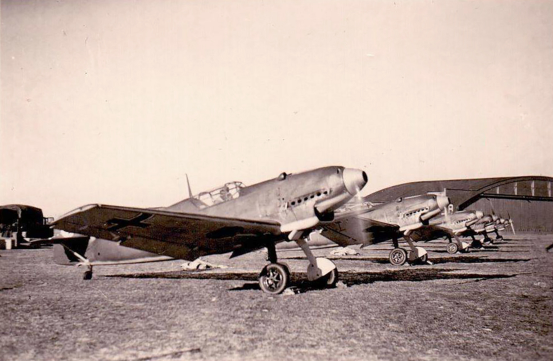 The Messerschmitt Bf 109 is a German World War II fighter aircraft that was the backbone of the Luftwaffe's fighter force. The Bf 109 first saw operational service in 1937 during the Spanish Civil War and was still in service at the dawn of the jet age at the end of World War II in 1945. It was one of the most advanced fighters of the era, including such features as all-metal monocoque construction, a closed canopy, and retractable landing gear. It was powered by a liquid-cooled, inverted-V12 aero engine. From the end of 1941, the Bf 109 was steadily being supplemented by the Focke-Wulf Fw 190. It was commonly called the Me 109, most often by Allied aircrew and among the German aces, even though this was not the official German designation.