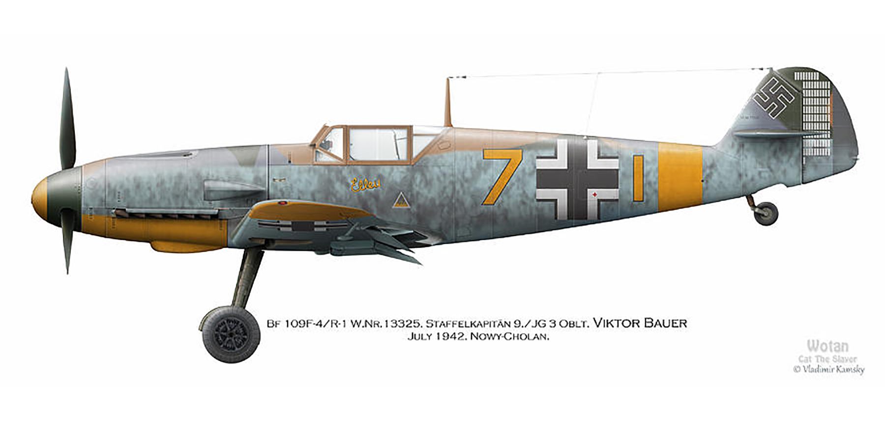 Messerschmitt Bf 109F4 9.JG3 Yellow 7 Viktor Bauer Nowy Cholan July 1942 by Vladimir Kamsky 0A
