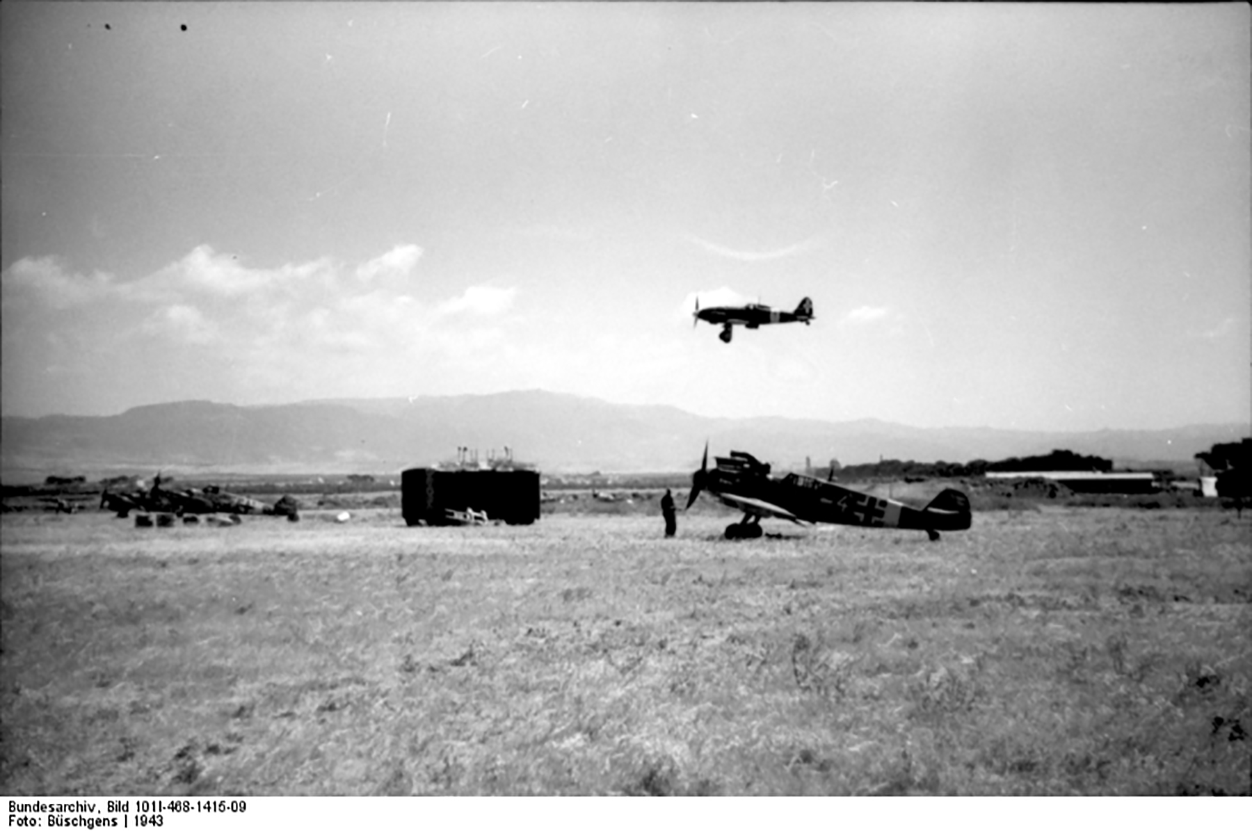 Messerschmitt Bf 109G6 4.JG51 White 4 Italian MC-202 landing in the background Italy 02